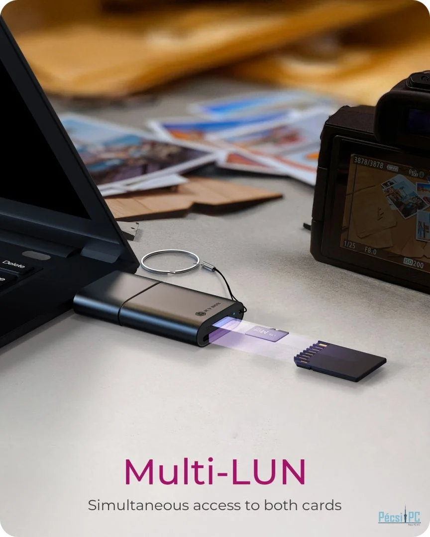 Egyszerre több memóriakártyához is hozzáférhet cserélgetés nélkül. A Multi-LUN támogatással a kártyaolvasó minden egyes kártyahelyet külön meghajtóként rögzít, így egyszerre olvashat és továbbíthat adatokat különböző kártyákról.