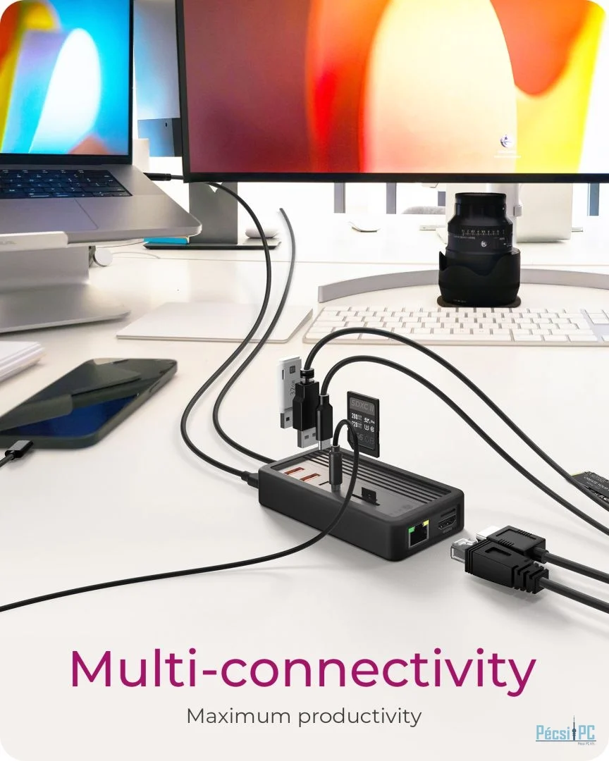 A beépített HDMI-port éles és részletes képi megjelenítést biztosít maximális 4K felbontással 60 Hz-en. Akár egy második képernyőre van szüksége a többfeladatos munkavégzéshez, akár egy kibővített kijelzőre a prezentációkhoz, vagy egy nagyobb munkaterületre a kreatív projektekhez, ez a dokkolóállomás nagyfelbontású videokimenetet biztosít.