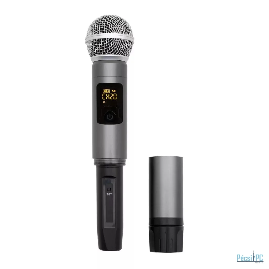 A mikrofon két AA elemmel működik (nem tartozék), míg a vevőegység beépített 500 mAh Li-Ion akkumulátorral rendelkezik, amely ~6 órás üzemidőt biztosít egyetlen töltéssel. Az USB–microUSB töltőkábel lehetővé teszi a folyamatos töltést, így megszakítás nélkül használható hosszabb rendezvények alatt is. A 550–565,2 MHz-es működési frekvenciasáv biztosítja a stabil jelátvitelt, akár 40 méteres hatótávolságig nyílt terepen.