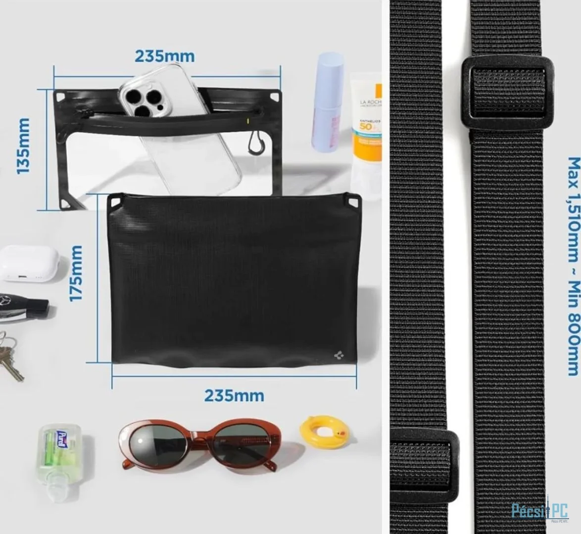 A Spigen A640 univerzális vízálló tok Crossbag egy modern, multifunkcionális vízálló táska, amely tökéletesen alkalmas utazáshoz és szabadtéri tevékenységekhez. Két levehető zsebbel rendelkező moduláris rendszerének köszönhetően a zsebek külön-külön vagy együtt is használhatók, így rugalmas megoldást kínálnak az Ön igényeinek megfelelően.