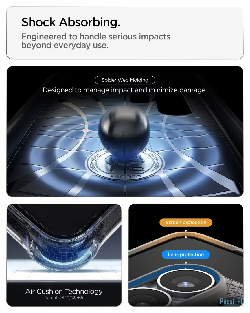 Air Cushion® technológia: Katonai szintű tanúsítvánnyal (MIL-fokozat) rendelkezik, a sarkokban speciális légkamráknak köszönhetően pedig elnyeli az esésekből származó ütéseket.