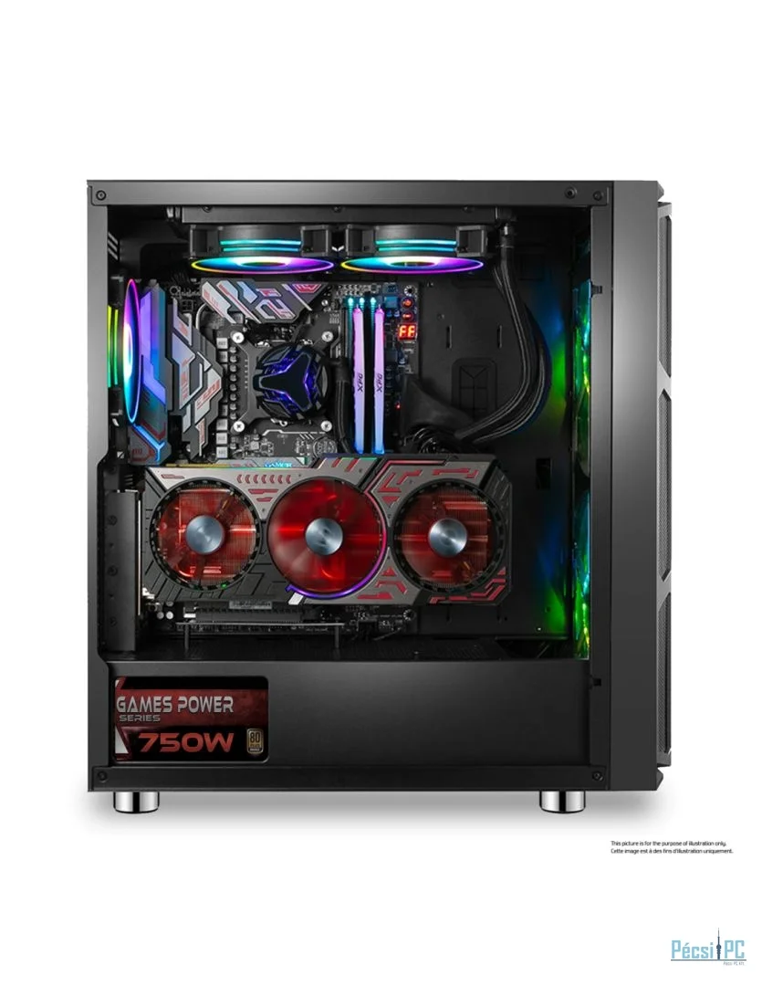 E-ATX, Black, 4x3,5", 5x2,5", 2xUSB2.0, 2xUSB3.0, Audio, Táp nélkül, 465x215x480mm, Ventilátor:2x14cm, 2x12cm, Tempered glass window, RGB, Gamer