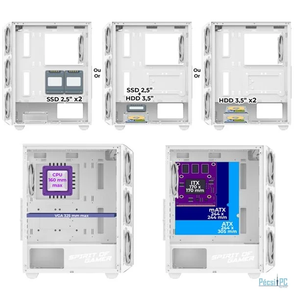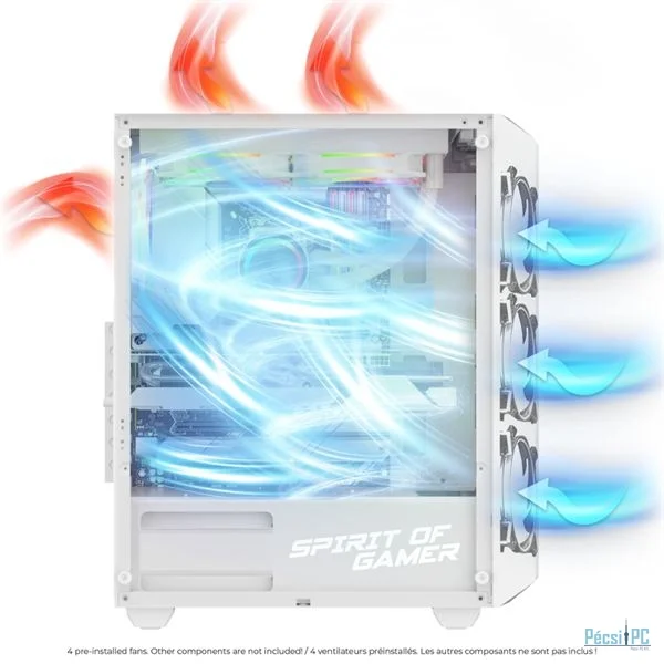 ATX, White, 2x3,5", 2x2,5", 2xUSB2.0, 1xUSB3.0, Audio, Táp nélkül, 495x440x255mm, Ventilátor:4x12cm, Tempered glass window, RGB, Gamer