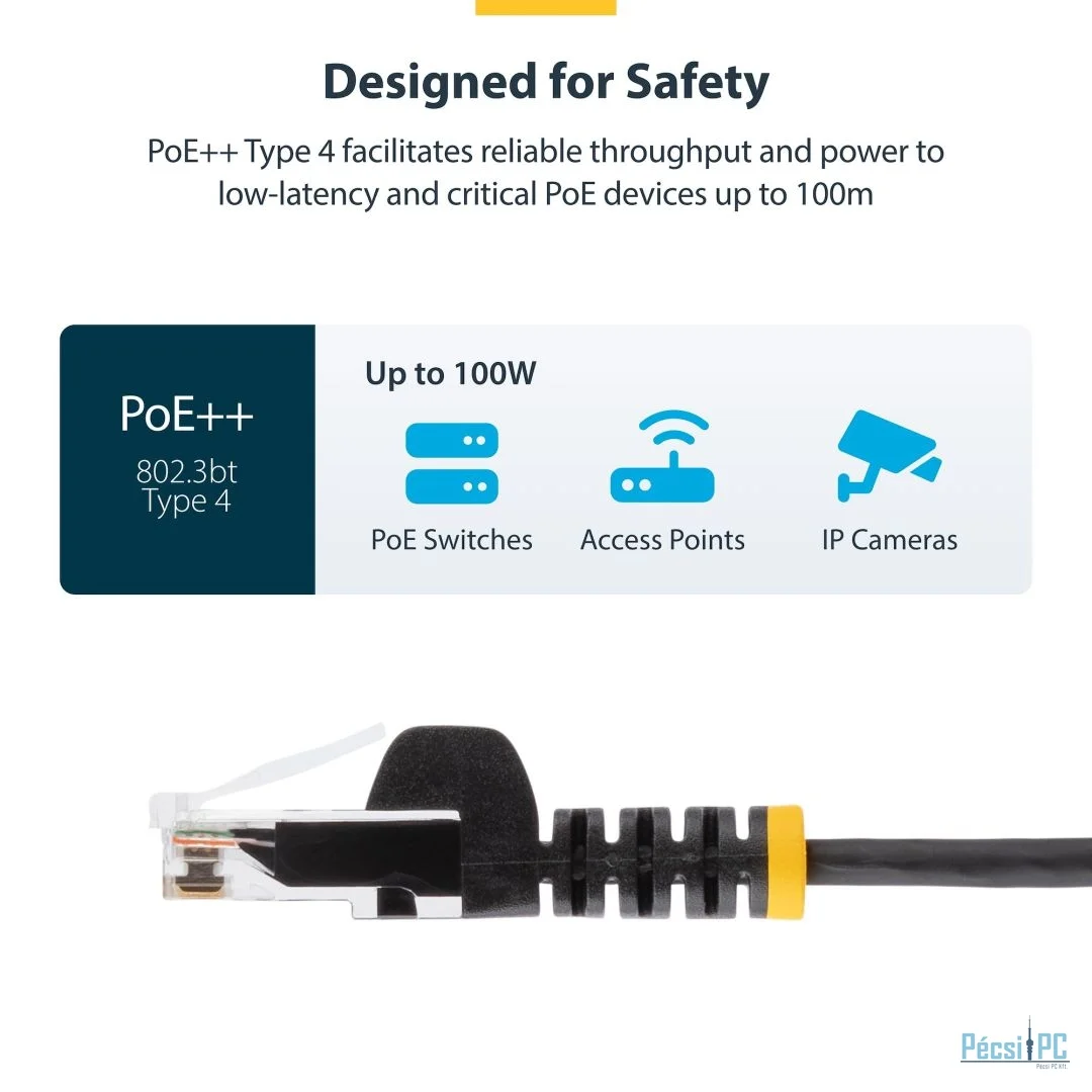 Minden kábelt külön-külön tesztelnek Fluke® DSX2-8000 CableAnalyzer™ készülékkel, hogy megfeleljenek az ANSI/TIA-568.2-D 6. kategória előírásainak, biztosítva az állandó jelintegritást minimális Near-End Crosstalk (NEXT) és Retun Loss (RL) értékekkel. Megbízhatóan biztosít akár 100 W PoE++ teljesítményt távoli hálózati eszközök, például PoE kapcsolók és tárgyalótermi kamerák áramellátásához. Ez a vékony Cat6 patch kábel megfelel az IEEE 802.3bt Type 4 PoE++ előírásoknak.