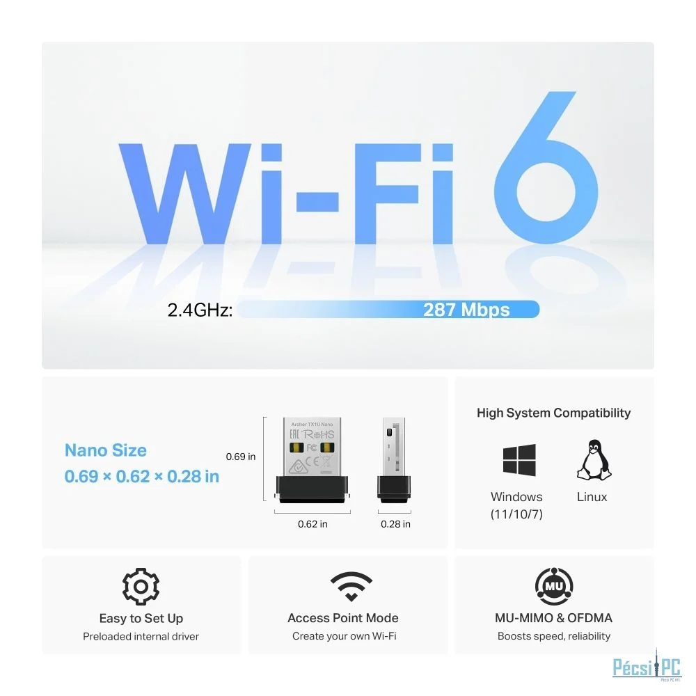 Villámgyors, szilárd kapcsolatok - A Wi-Fi 6 technológiát kihasználva akár 287 Mbps sebességű, villámgyors sebességet érhet el a hibátlan webböngészéshez, azonnali e-mail válaszokhoz és zökkenőmentes közösségi média megosztáshoz. Kompakt és hordozható - Nano-méretű (0,69×0,62×0,28 hüvelyk) a villámgyors vezeték nélküli kapcsolatért - tökéletes utazáshoz és távmunkához. Egyszerű telepítés - Előre feltöltött belső meghajtóval rendelkezik az azonnali csatlakoztathatósághoz, kiküszöbölve a fárasztó folyamatokat, és lehetővé téve az egyszerű, problémamentes csatlakoztatást. Zökkenőmentesebb online élmény - MU-MIMO routerekkel működik, amelyek egyidejű adatfolyamokat biztosítanak, növelve az átviteli sebességet és a hatékonyságot. Zökkenőmentes Wi-Fi hotspot-megosztás - Az AP mód kihasználásával eszközét robusztus Wi-Fi hotspottá alakíthatja, kényelmesen biztosítva a gyors internet-hozzáférést számos kapcsolat számára. Széles körű kompatibilitás - A támogatott operációs rendszerek közé tartozik a Windows (11/10/7) és a Linux (Kemel 3.10 és újabb).