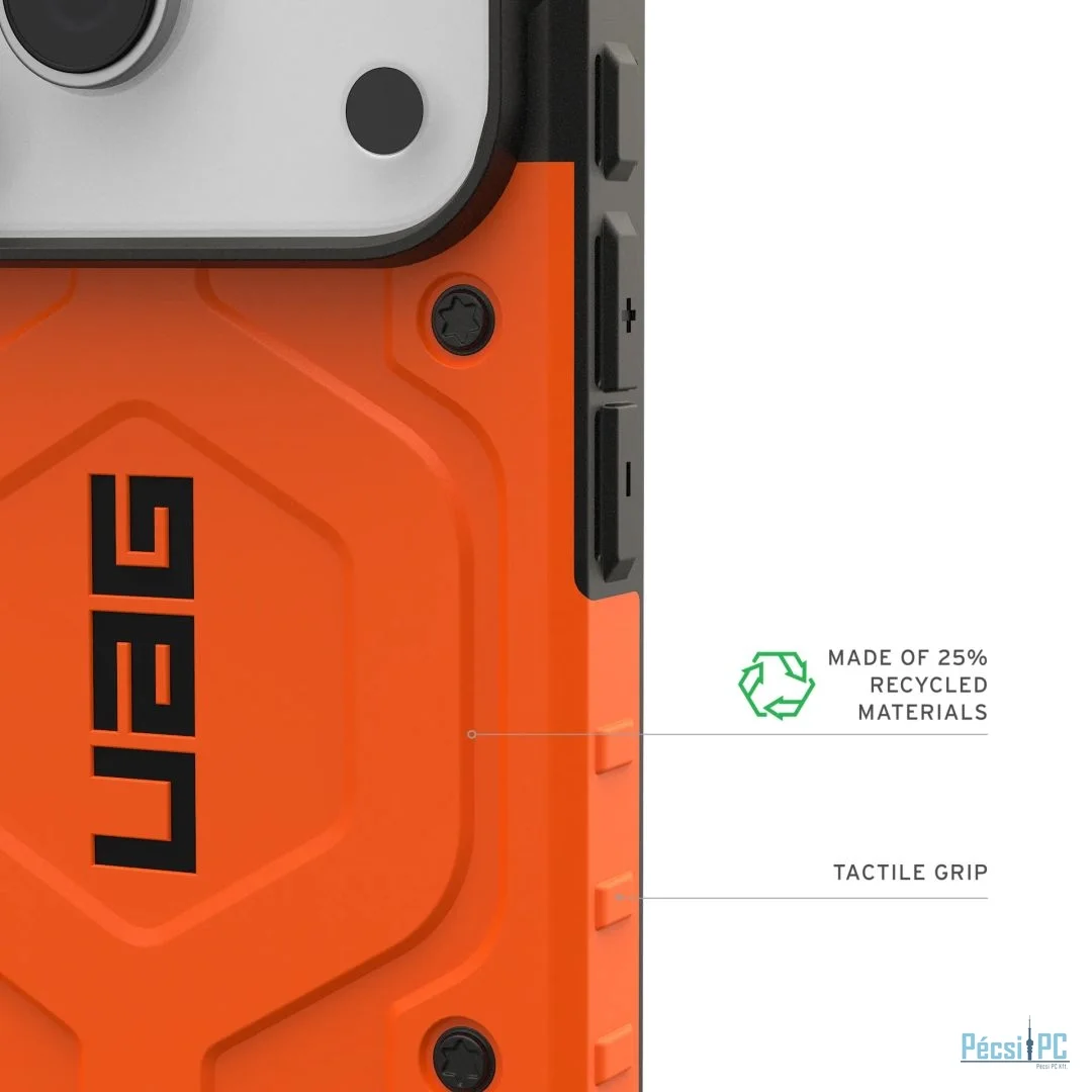 A Pathfinder sorozatú tok ideális választás azok számára, akik masszív, kalandokra alkalmas védelmet keresnek teljes MagSafe kompatibilitással. Most kizárólag online, exkluzív narancssárga színben. Ez a tok egy ultrakönnyű páncélozott héjat kombinál ütésálló kerettel és hexamintás maggal, amely kiváló esés- és ütésvédelmet nyújt. A megemelt képernyő körbevétele megvédi a kijelzőt a véletlen leeséstől, míg a strapabíró TPU ütközők extra sarokvédelmet biztosítanak. A nagy teljesítményű beépített mágneses modulnak köszönhetően készüléked biztonságosan rögzül a helyén, így zökkenőmentes MagSafe töltési kompatibilitást biztosít, és támogatja az Apple Payt.