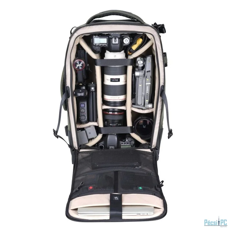 A VEO Select 58T álcázott "poggyász" stílusának köszönhetően senki sem fogja kitalálni, hogy az összes fényképezőgép-felszerelését hordozza. Ennek a jól párnázott "kis bőröndnek" a belsejében egy tágas belső rekesz található, számos sokoldalú elválasztó rekesszel, amelyek úgy állíthatók be, hogy 2-3 markolatú DSLR fényképezőgép csatlakoztatott objektívekkel, 2-4 extra objektív (400mm f/2.8-ig), 2 vaku, kiegészítők (memóriakártyák, kábelek, akkumulátor, töltő),