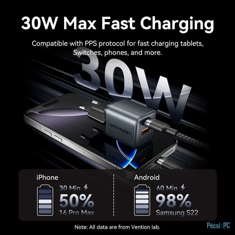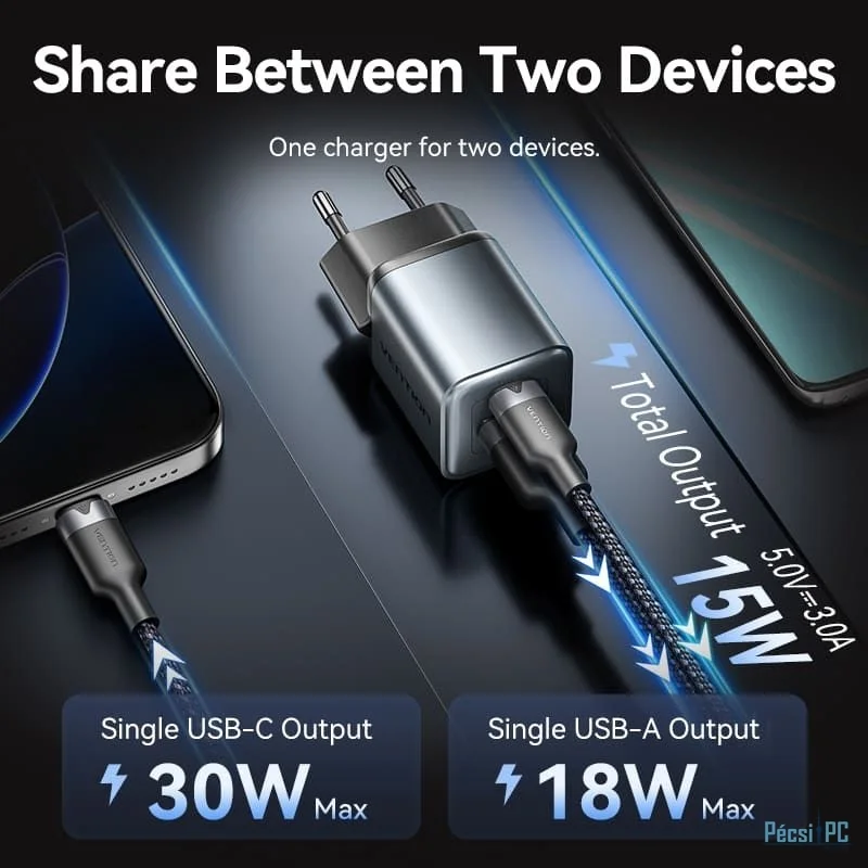 Adapter, 1xUSB-A, 1xUSB-C, 5V/9V/12V/15V/20V, 3A, 30W, QC, PD, Grey