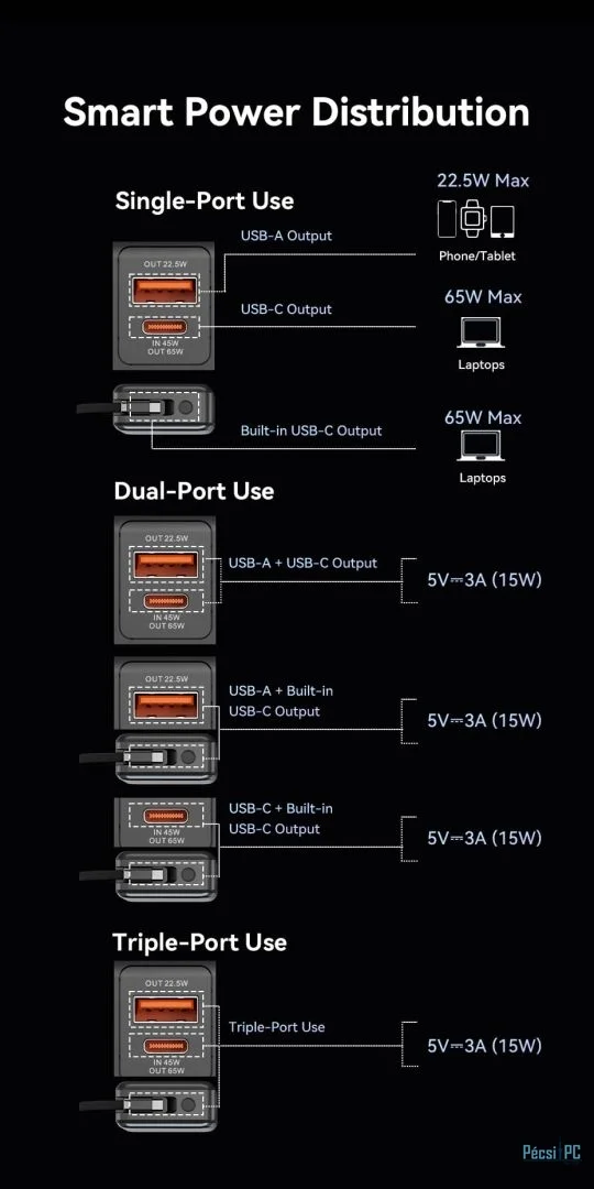 - Maximális kimenetek: USB-C 65 W; USB-A 22,5 W; beépített kábel 65 W.