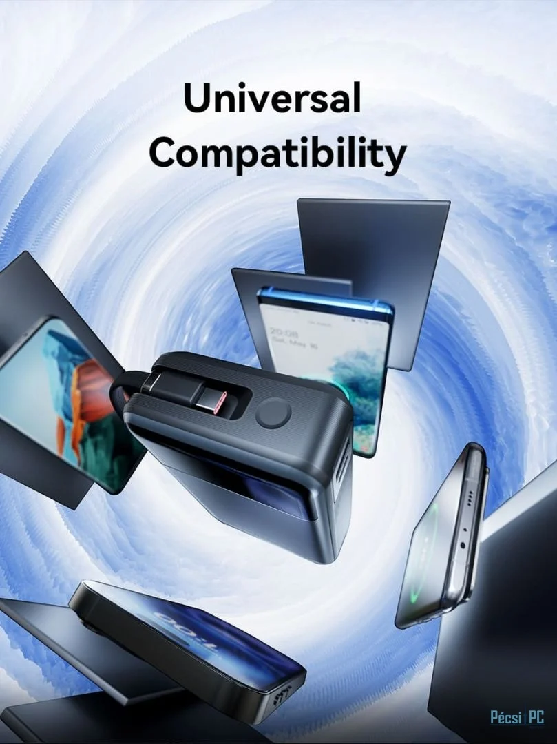 - Portok: USB-C bemenet/kimenet, USB-A kimenet, integrált USB-C kábel.