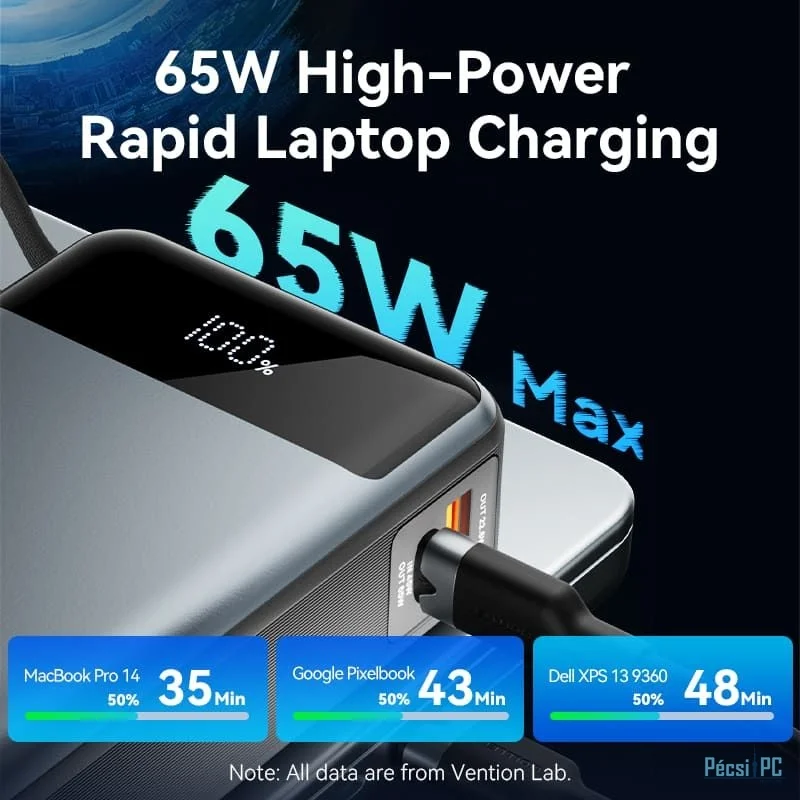 - 65W-os USB-C Power Delivery töltés laptopokat, táblagépeket és játékkonzolokat közel konnektoros sebességgel.