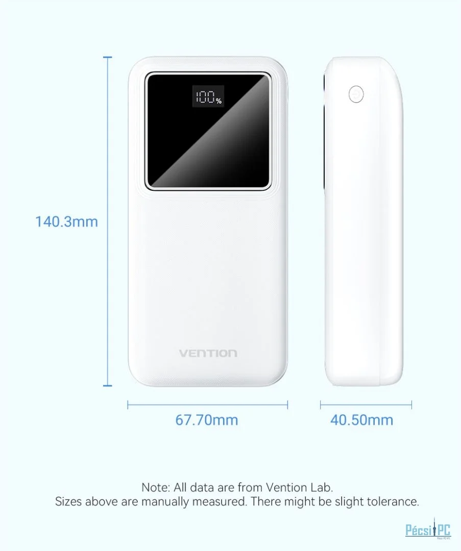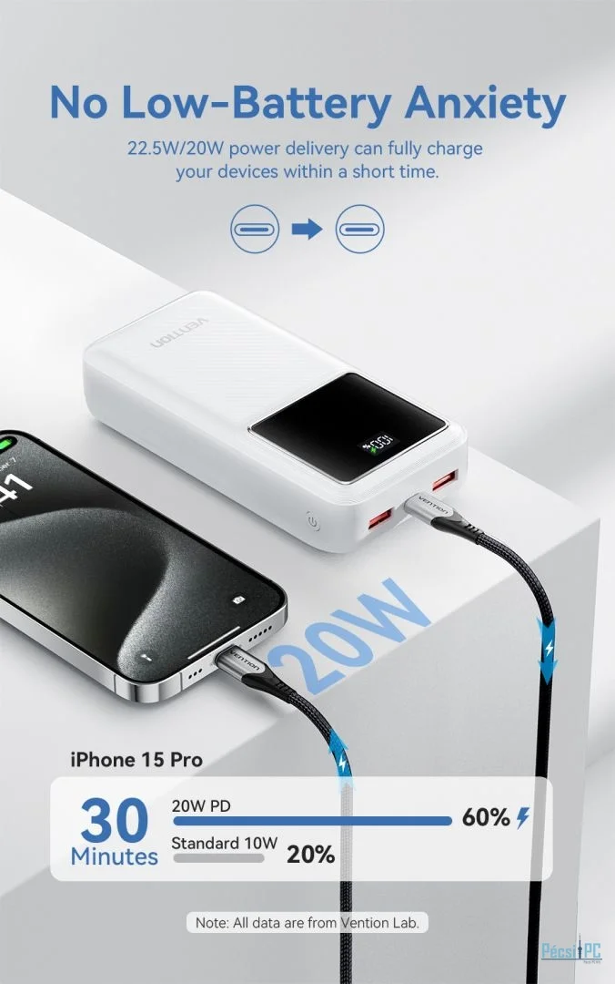 Lenyűgözően nagy kapacitás: A Vention Power Bank rendkívüli, 30000mAh (3,7V/111Wh) akkumulátor-kapacitással büszkélkedhet, így okostelefonját, táblagépét és más elektronikus eszközeit többször is feltöltheti anélkül, hogy konnektort kellene keresnie.