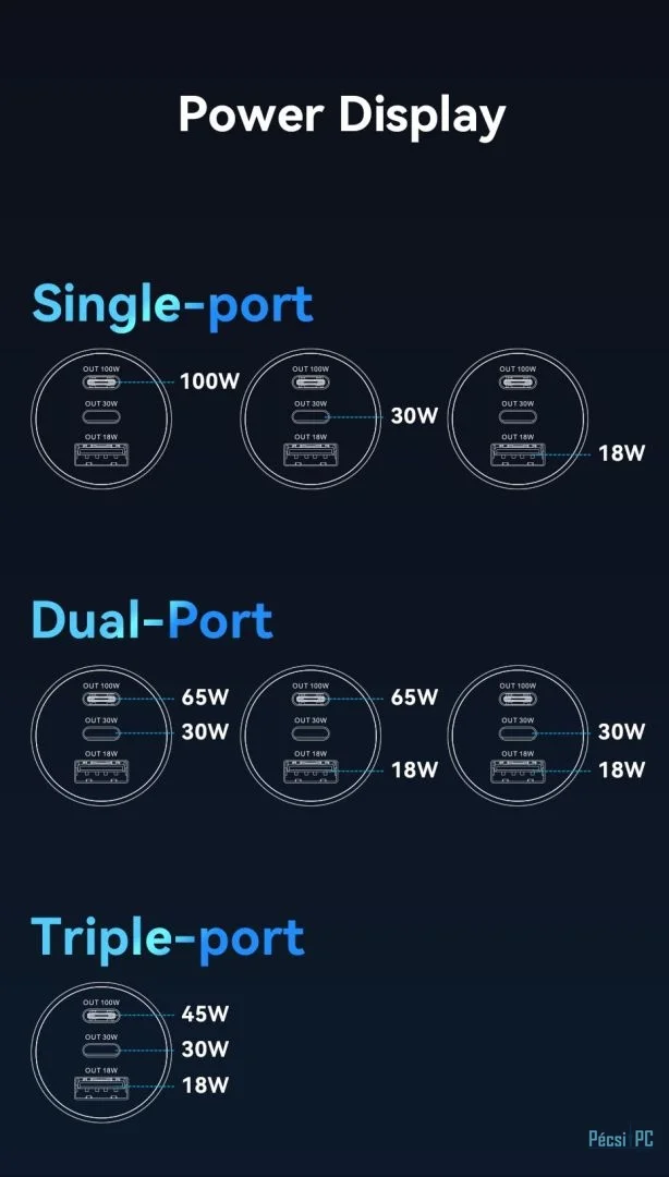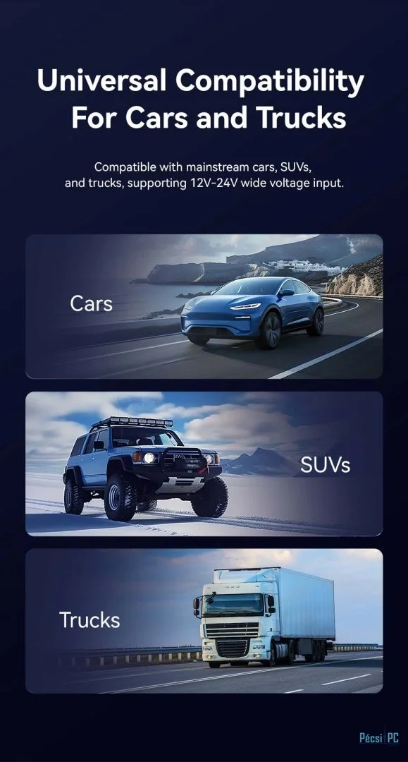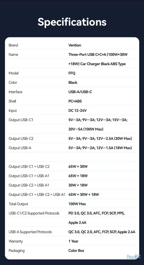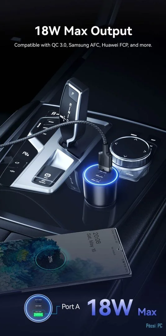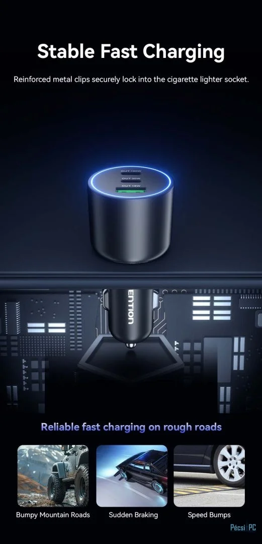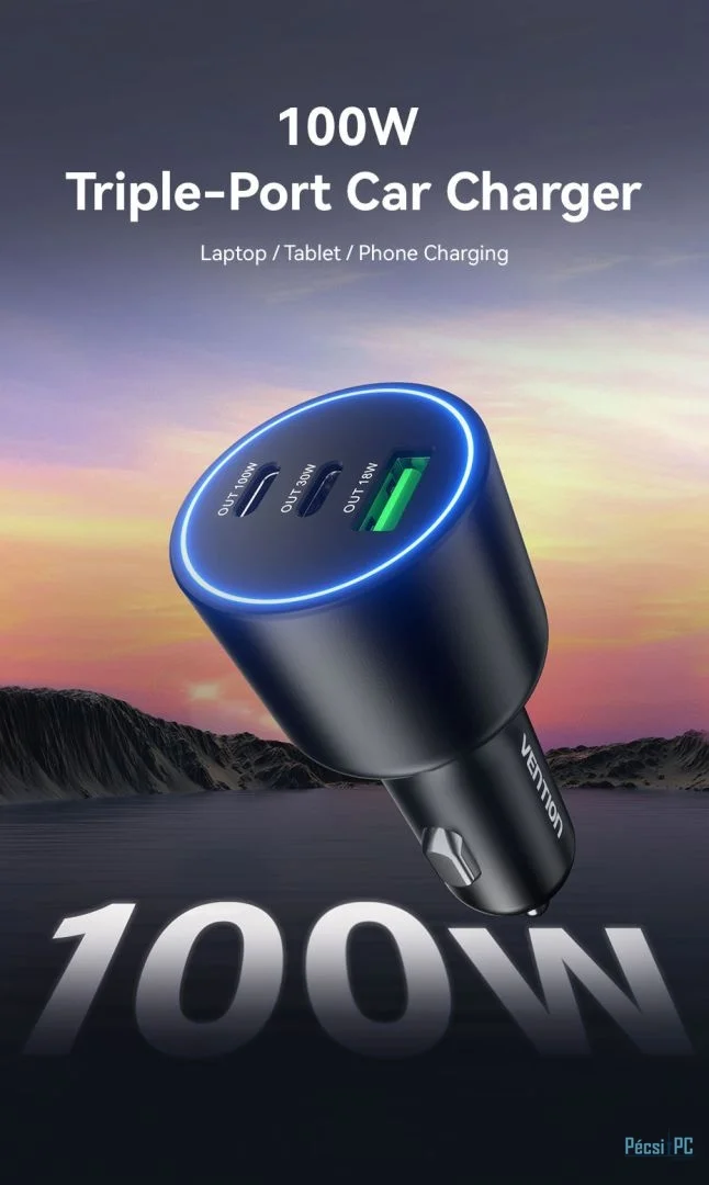 Autós töltő, 1xUSB-A, 2xUSB-C, 5V/9V/12V/15V/20V, 5A, 100W, QC, Black