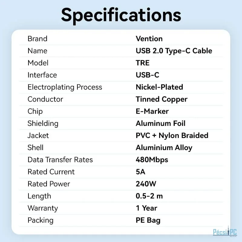 Bemutatjuk a figyelemre méltó Vention USB-C kábelt, egy olyan terméket, amely kiemelkedik a ma piacon kapható tipikus töltőkábelek közül. Ezt a kábelt nem csak a gyors töltés, hanem a hosszabb élettartam érdekében is aprólékosan tervezték, így ez a kábel a tökéletes kiegészítő a nagy teljesítményű készülékekhez és az igényes töltési igényekhez.