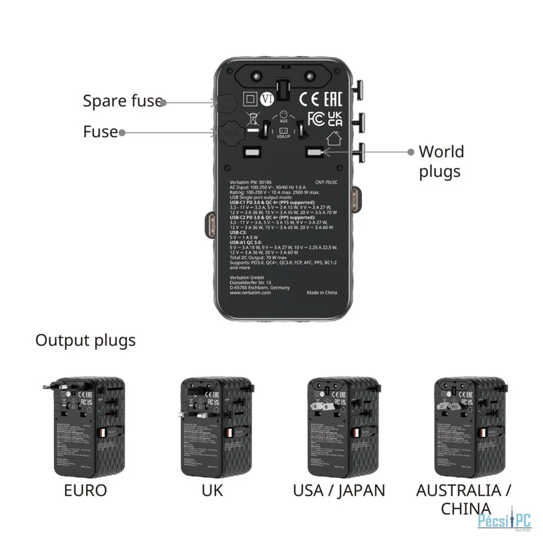Verbatim Charge ''''n'''' Travel 70W GaN III Universal Travel Adapter with 2 Retractable USB-C Cables Black