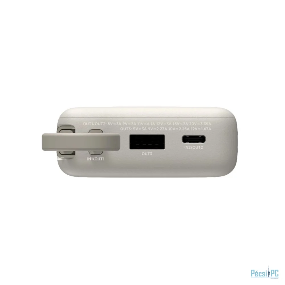 A power bank nemcsak leadni, de fogadni is gyorsan tudja az energiát. Támogatja a 65W-os bemeneti gyorstöltést, mind az integrált kábelen, mind a külön USB-C porton keresztül. Ezzel mindössze 1 óra 16 perc alatt teljesen feltölthető, ami 36%-kal gyorsabb, mint az előző modell esetében.