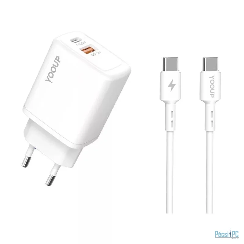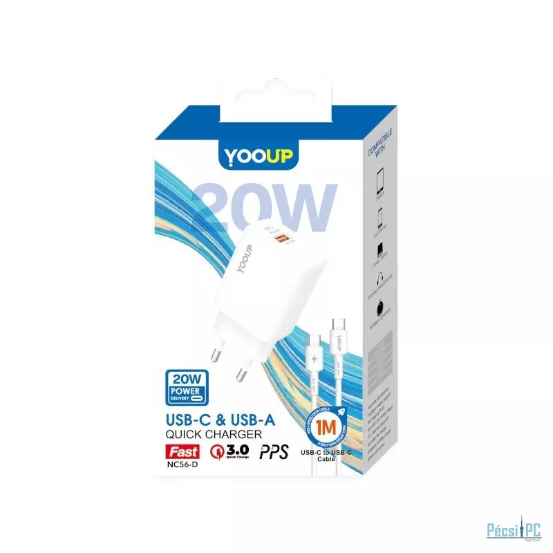 Hálózati töltő, 1xUSB-A, 1xUSB-C, Kábel csatlakozó USB-C , 5V/9V/12V, 3A, 20W, QC, PD, White