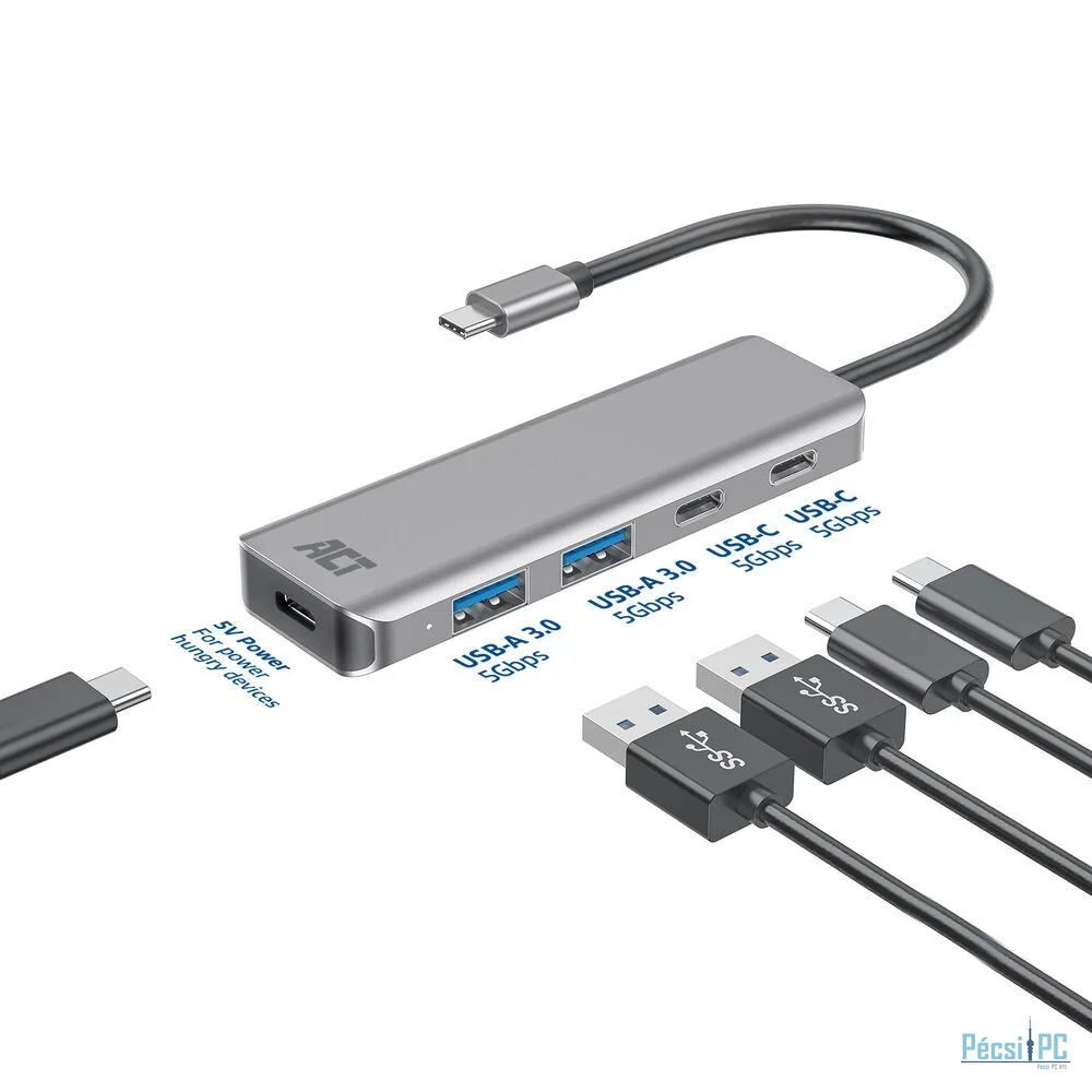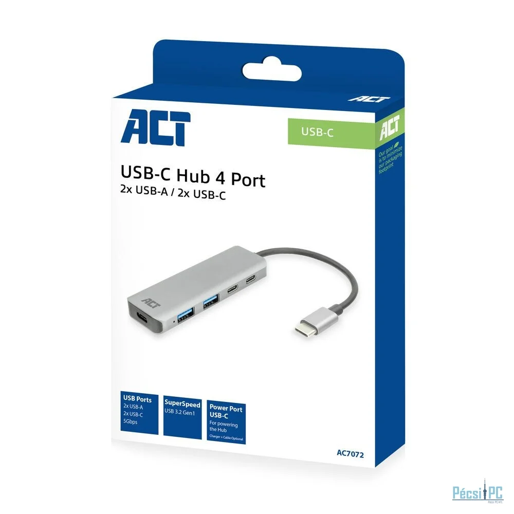 Az ACT AC7072 USB-C hub két USB-A és két USB-C porttal bővíti laptopját vagy számítógépét. A hub kompatibilis az USB 3.2 Gen1 szabvánnyal, más néven USB 3.0-val, amely SuperSpeed USB 5Gbps sebességet kínál. A beépített USB-C tápcsatlakozó további energiát biztosíthat a csatlakoztatott USB-A/USB-C eszközök számára, amelyek több energiát igényelnek.