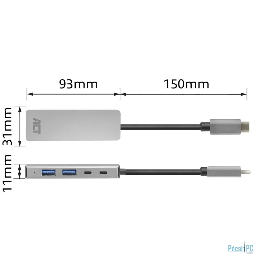 Az ACT AC7072 USB hub könnyű, tömör alumínium kialakítású, így könnyen elfér a laptop táskájában. A hub négy extra USB-porttal bővíti laptopját vagy számítógépét USB-A és USB-C perifériák csatlakoztatásához. Csatlakoztassa az USB hubot a számítógép USB-C portjához.