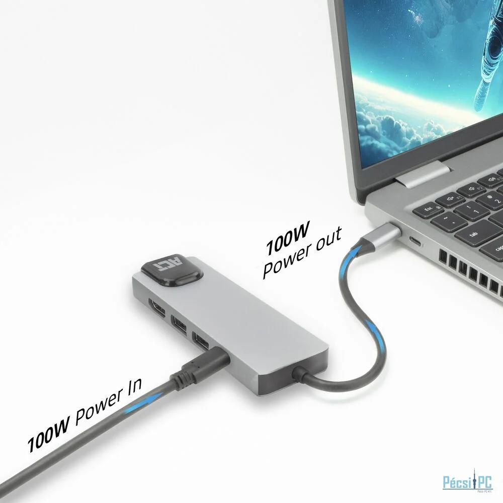 Egy USB-C port általában adatot, videót, tápellátást vagy a három kombinációját támogathatja. Ha a notebookod rendelkezik olyan USB-C porttal, amely mindhármat támogatja: adat, videó és tápellátás, akkor az AC7091 PD pass-through portja használható a laptop töltésére. A multiport dokkolóhoz csatlakoztatva a laptop áramellátása az USB-C Power Delivery pass-through porton keresztül történik, amely a laptop USB-C tápegységéről kap áramot.