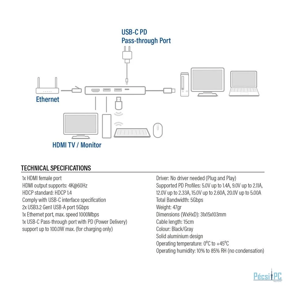 Az AC7091 USB-C 4K dokkolóállomás egyetlen USB-C kábellel teljes munkaállomássá alakítja laptopját. Ez az 5 az 1-ben multiport dokkoló HDMI, Gigabit Ethernet, két USB-A porttal és egy USB-C PD átmenő porttal egészíti ki laptopját. Ez a masszív alumíniumból készült multiport dokkoló USB tápegységgel működik, nincs szükség külső tápegységre.