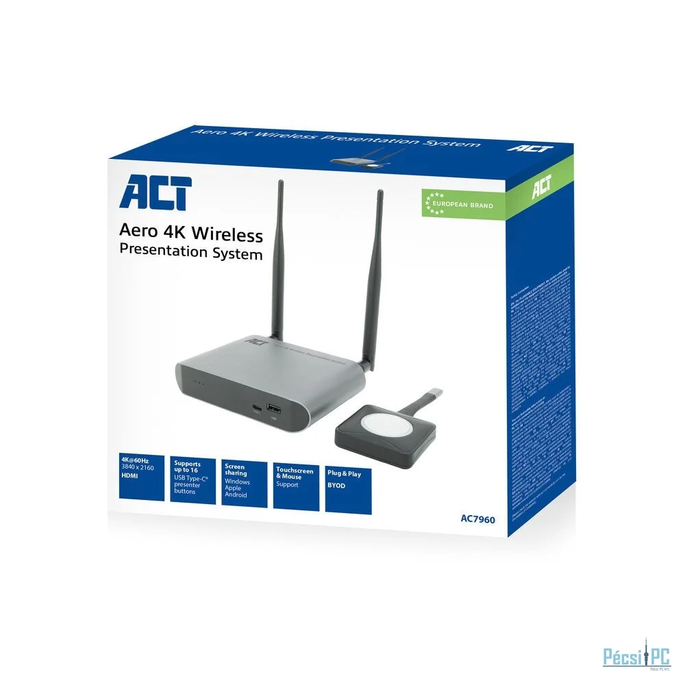 Az AC7960 Aero 4K vezeték nélküli prezentációs rendszer a dobozból kivéve egy teljes kezdő készletet tartalmaz, amely a következőket tartalmazza: