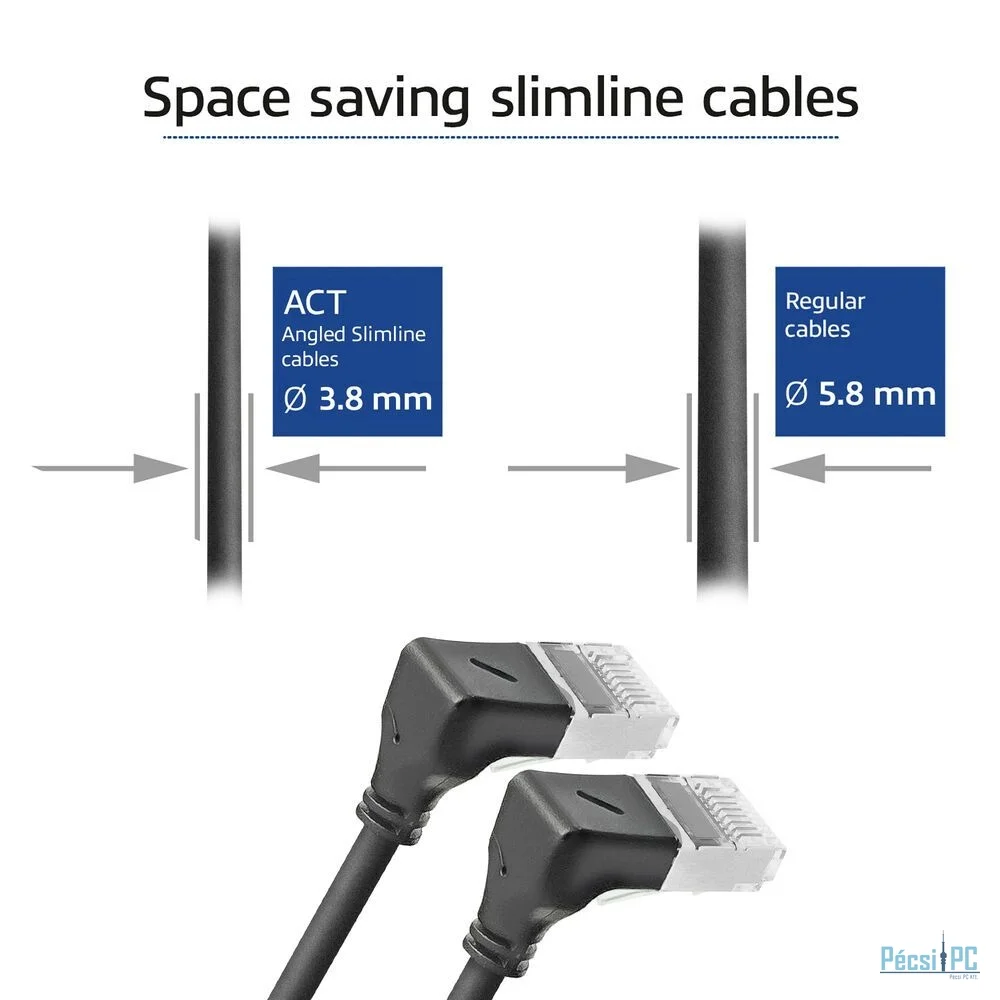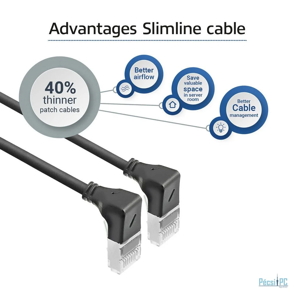 A patch kábel egyenes RJ45 csatlakozóval és egy 90°-ban lefelé hajlított RJ45 csatlakozóval rendelkezik. Ideális olyan helyekre, ahol korlátozott a hely, de a hajlítási sugár nem lehet kompromisszum. Például hálózati szekrényekben és berendezések mögött.