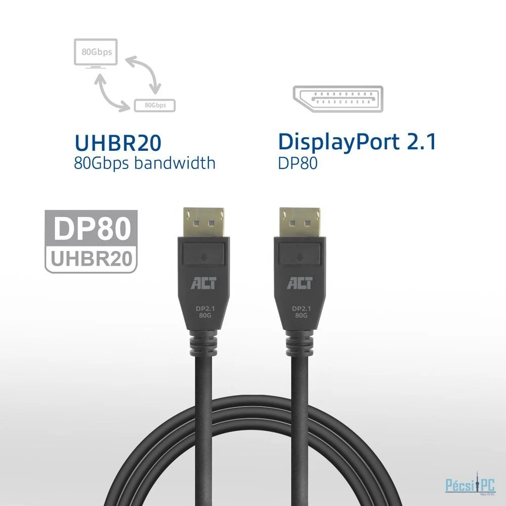 Az ACT 8K DisplayPort 2.1 DP80 UHBR20 kábel igényes alkalmazásokhoz alkalmas, és kristálytiszta videó- és hangátvitelt biztosít. A DisplayPort kábel támogatja a 10K@30Hz, 8K@60Hz és 4K@240Hz maximális felbontást, valamint a 80 Gbps maximális sávszélességet. A DisplayPort támogatja a Display Stream Compression 1.2a (DSC) és a HDCP 2.2 szabványt.