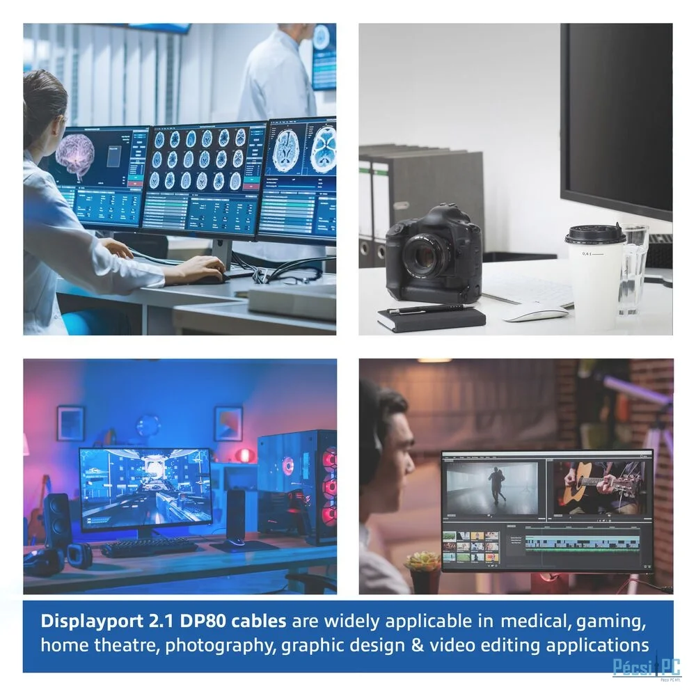 Orvosi alkalmazások: A nagy felbontású képalkotás kritikus fontosságú a radiológiában a részletes diagnózishoz. A 8K DisplayPort 2.1 DP80 UHBR20 kábelt a képalkotó berendezések nagyméretű kijelzőkhöz való csatlakoztatására használják.