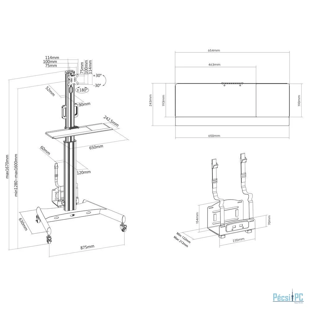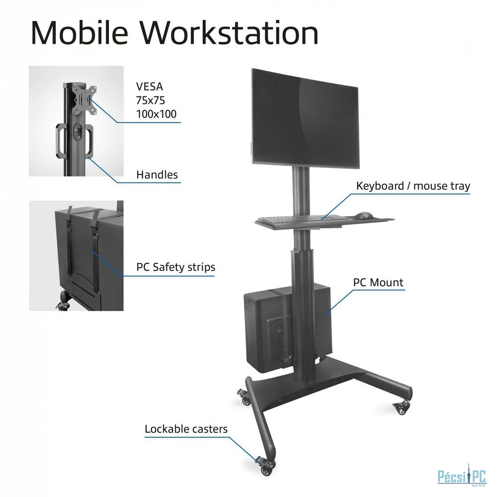 Ez a masszív fémállvány zárható görgokkel rendelkezik a kocsi kívánt irányba mozgatásához. Az állvány alkalmas VESA 75x75 és 100x100 képernyokhöz.
