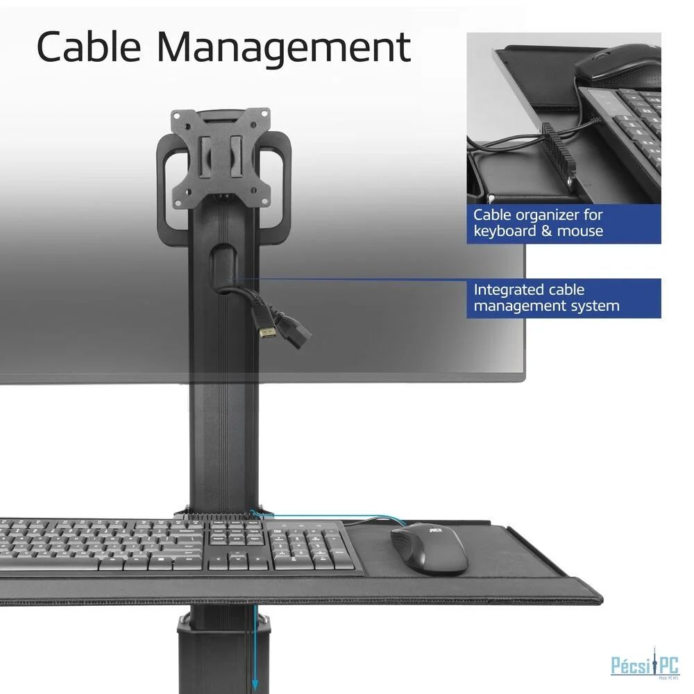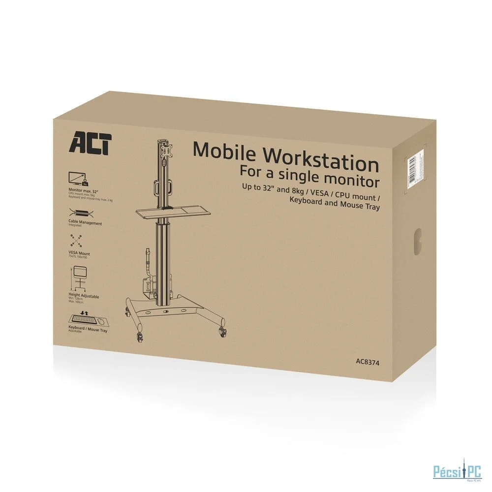 Az AC8374 mobil munkaállomás egy sokoldalú, hordozható megoldás, amelyet kényelmes munkaterület kialakítására terveztek. A mobil munkaállomás akár 32 hüvelykes (max. 8 kg) monitort is támogat VESA 75x75 és 100x100 felbontással. A legjobb látószöget érheti el a képernyo elforgatásával és megdöntésével. A munkaállomás tartalmaz egy biztonsági hevederekkel ellátott CPU-tartót, egy állítható billentyuzetet és egértálcát integrált egérpaddal és csuklótámasszal. Az integrált kábelrendezo rendszer rendezi a munkaterületet. Zárható görgoivel és kényelmes fogantyúival könnyedén áthelyezheti a számítógépes kocsit a kívánt helyre.