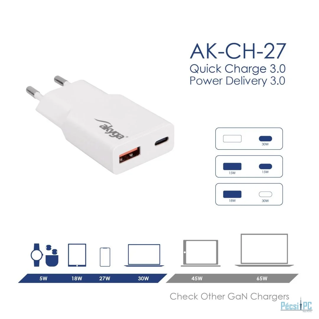 Akyga AK-CH-27 USB-A/USB-C PD 30W Quick Charge 3.0 GaN White