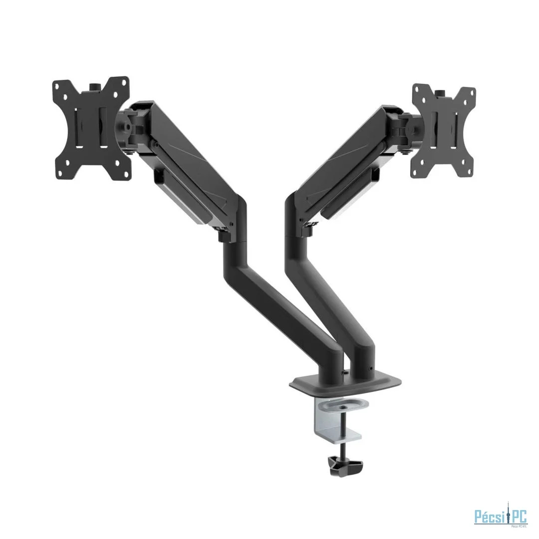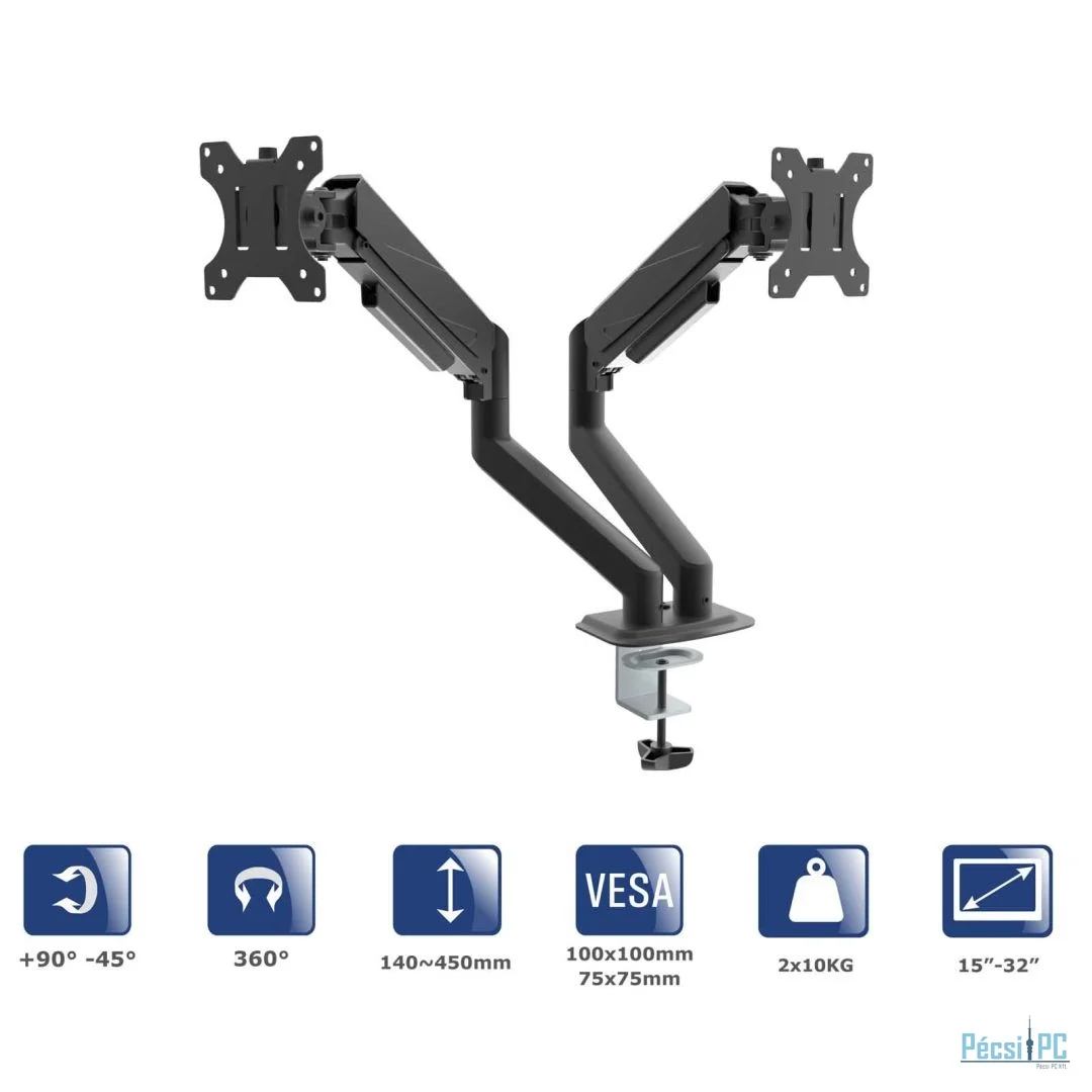 Az asztali tartó kivételes rugalmasságot kínál, mindezt a két gázrugón álló karjának köszönhetően. Mindegyik kar lehetővé teszi a dőlésszög, a magasság és az elfordítás független beállítását, így lehetővé teszi a képernyő tökéletes, egyéni igényeknek megfelelő pozicionálását. A PIVOT funkció lehetővé teszi a monitor tájolásának egyszerű megváltoztatását tájolásról portréra, ami a különböző munkakörülmények között további sokoldalúságot és kényelmet biztosít.