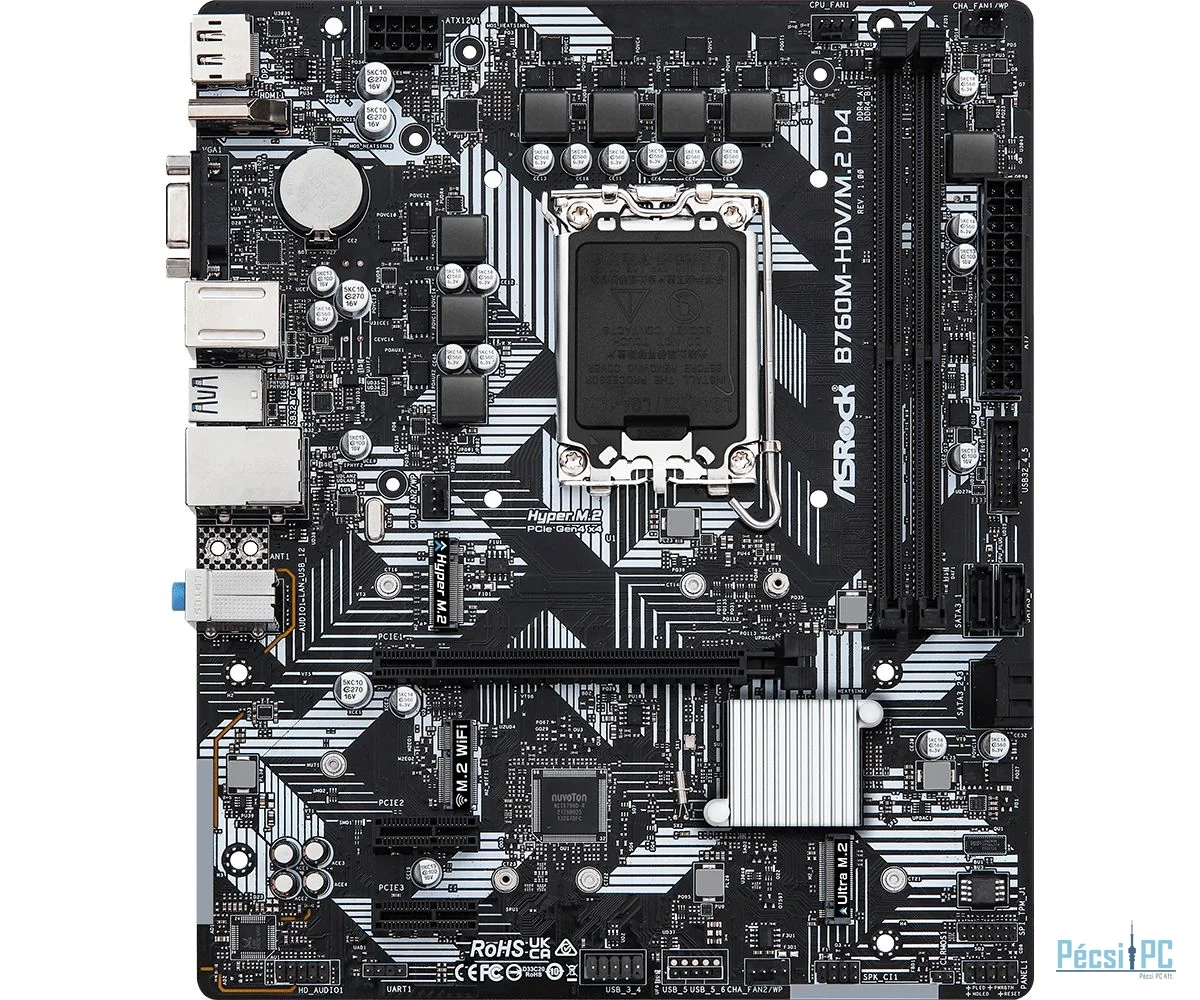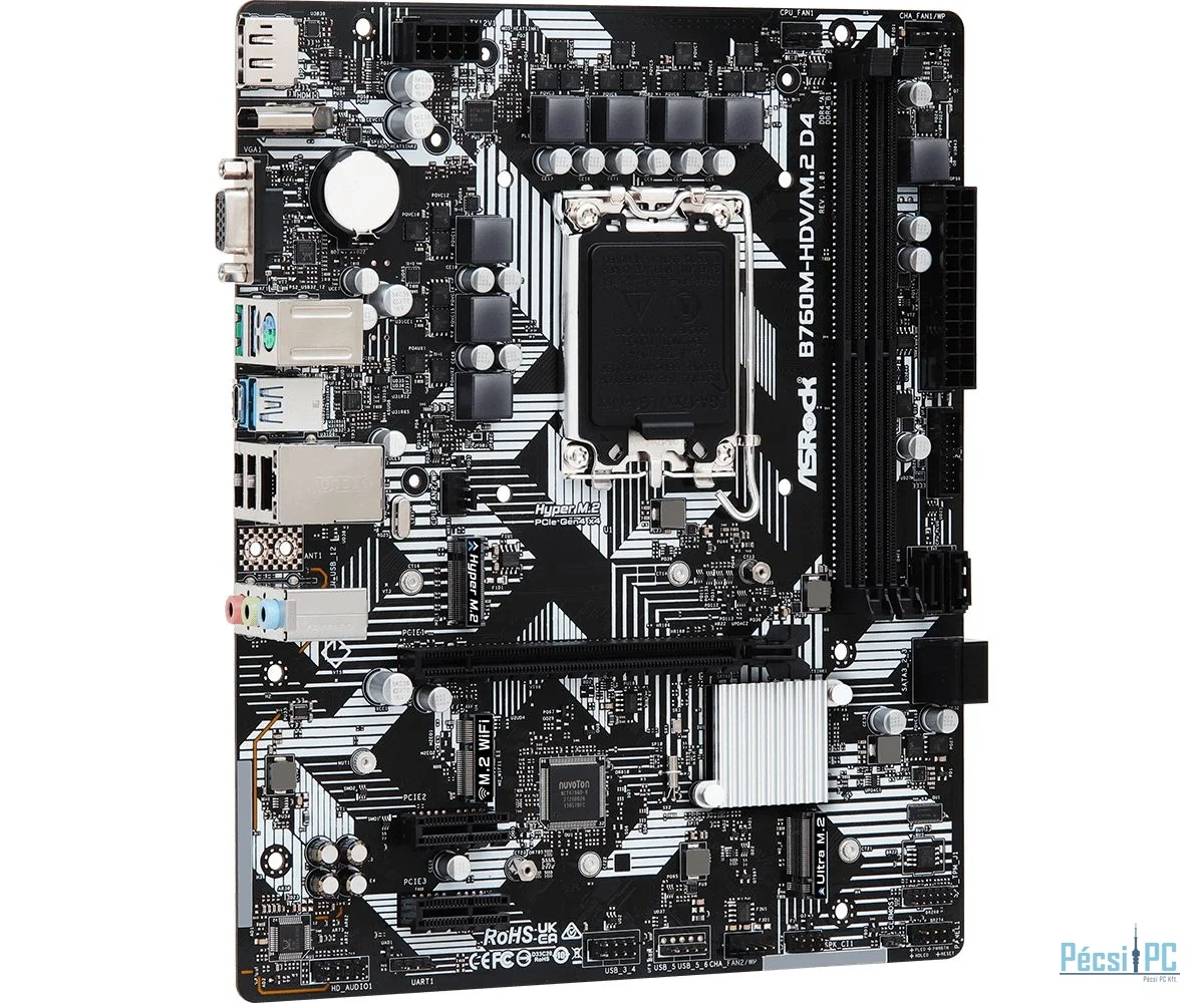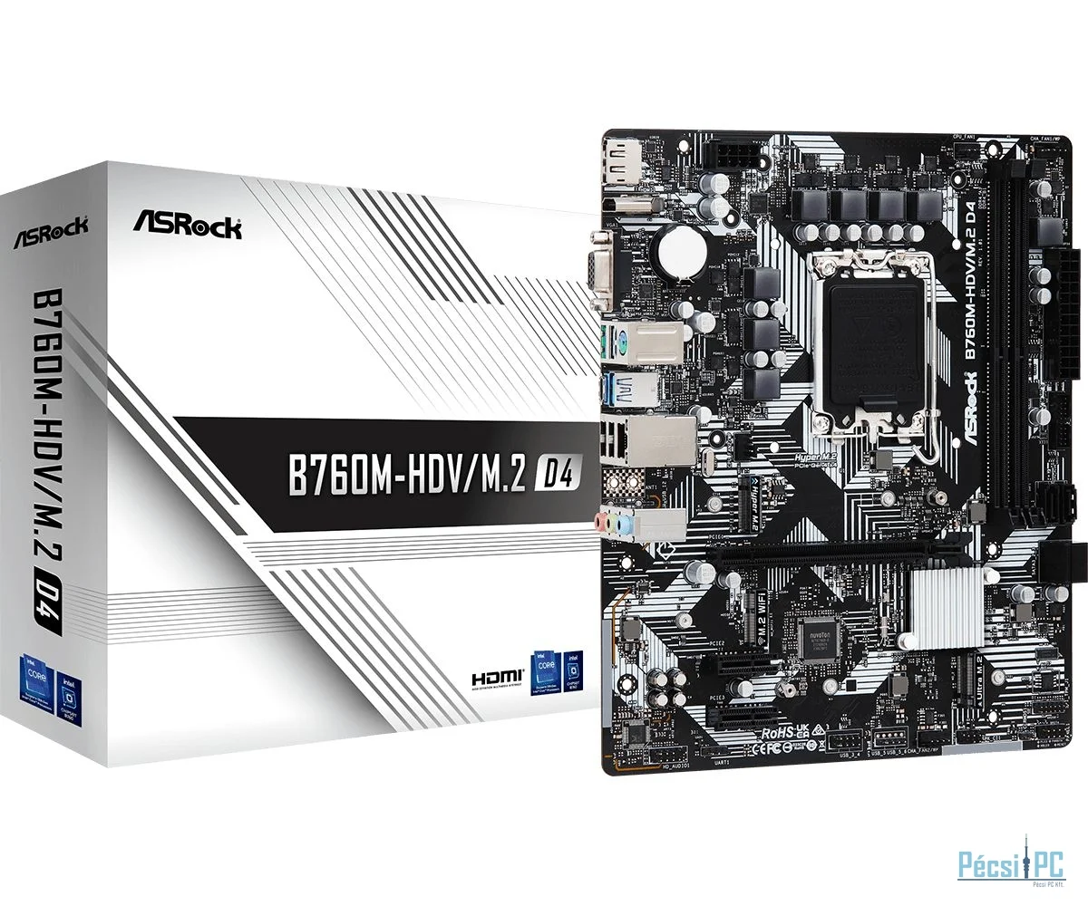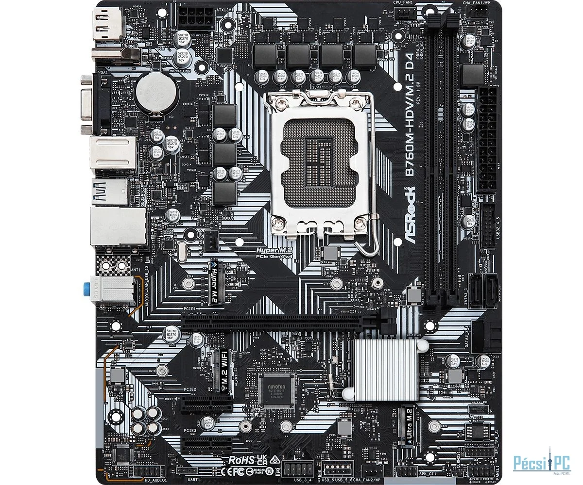 LGA1700, Intel B760, 2xDDR4, Max:3200MHz, Max:64GB, 1xPCIE16, 2xPCIE1, 4xSATA3, RAID, 2xUSB, 3xUSB3.2, 1xUSB3.2C, VGA, HDMI, DisplayPort, PS2:1 db, 7.1, Gigabit, 1xUltra M.2, 1xHyper M.2, Micro-ATX