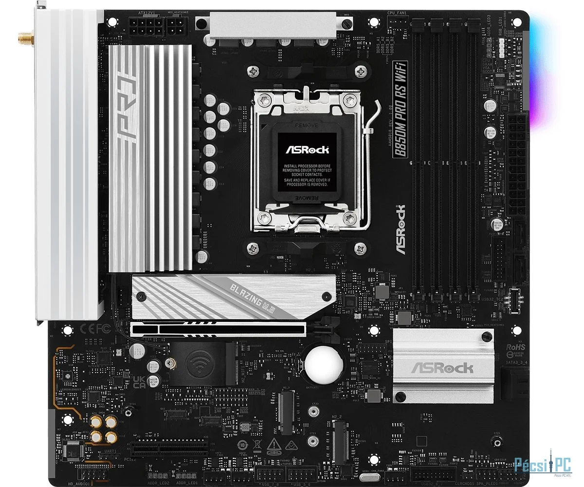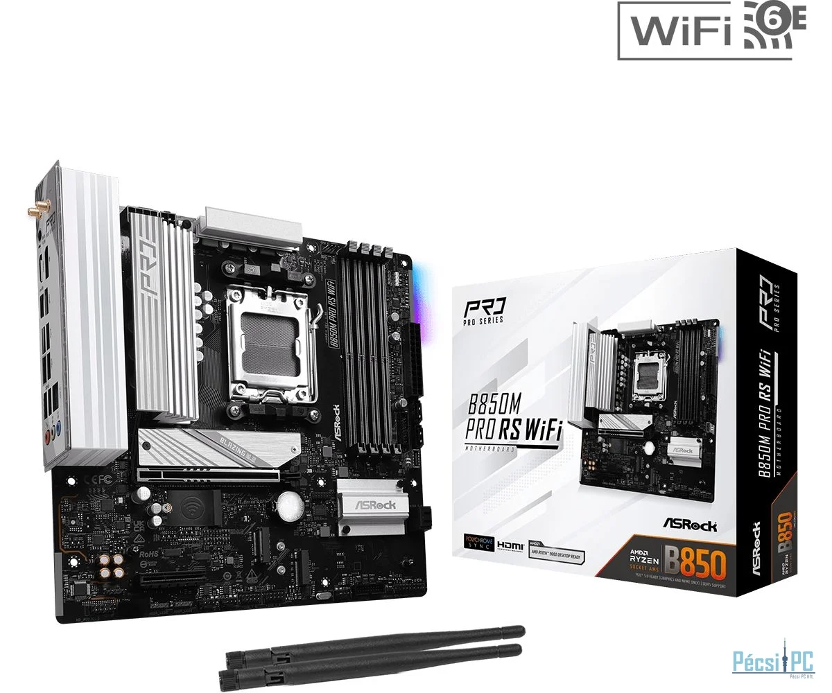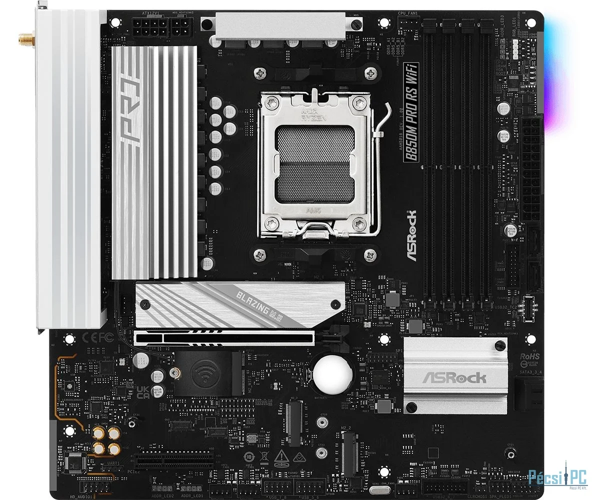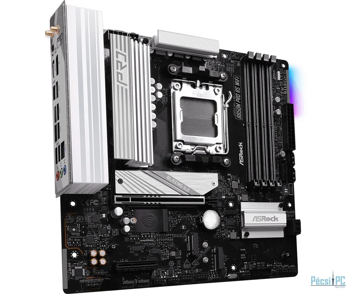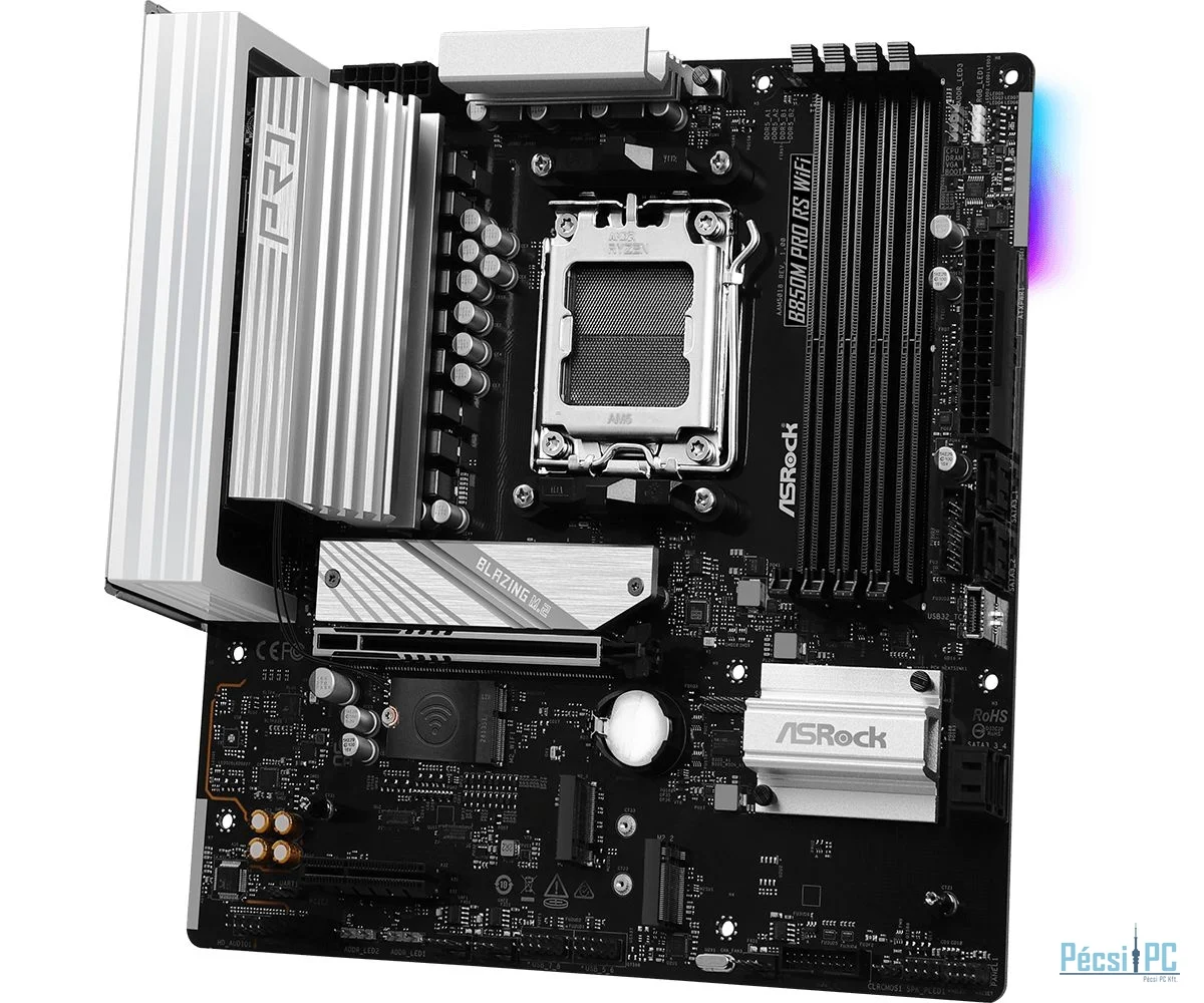 AM5, AMD B850, 4xDDR5, Max:5600MHz, Max:256GB, 1xPCIE16, 1xPCIE4, 4xSATA3, RAID, 4xUSB, 3xUSB3.2, 1xUSB3.2C, HDMI, DisplayPort, 7.1, 2.5Gb/s LAN, WiFi, Bluetooth, 2xHyper M.2, 1xBlazing M.2, Micro-ATX, RGB, Gamer