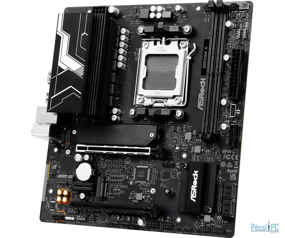 AM5, AMD B850, 2xDDR5, Max:5600MHz, Max:128GB, 2xPCIE16, 1xPCIE1, 4xSATA3, RAID, 2xUSB, 3xUSB3.2, 1xUSB3.2C, HDMI, DisplayPort, 7.1, 2.5Gb/s LAN, 1xHyper M.2, 1xBlazing M.2, Micro-ATX