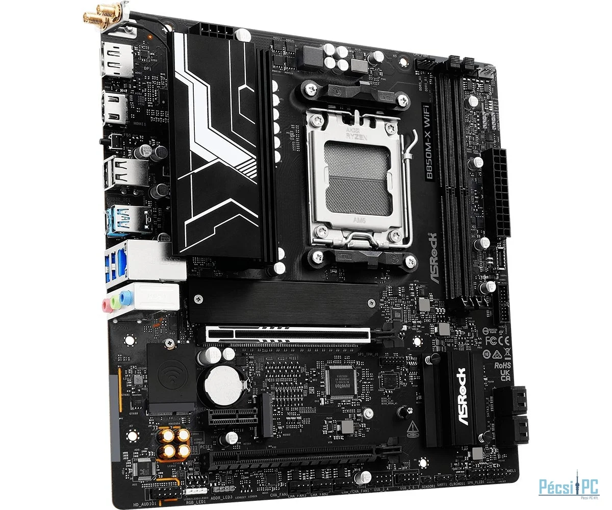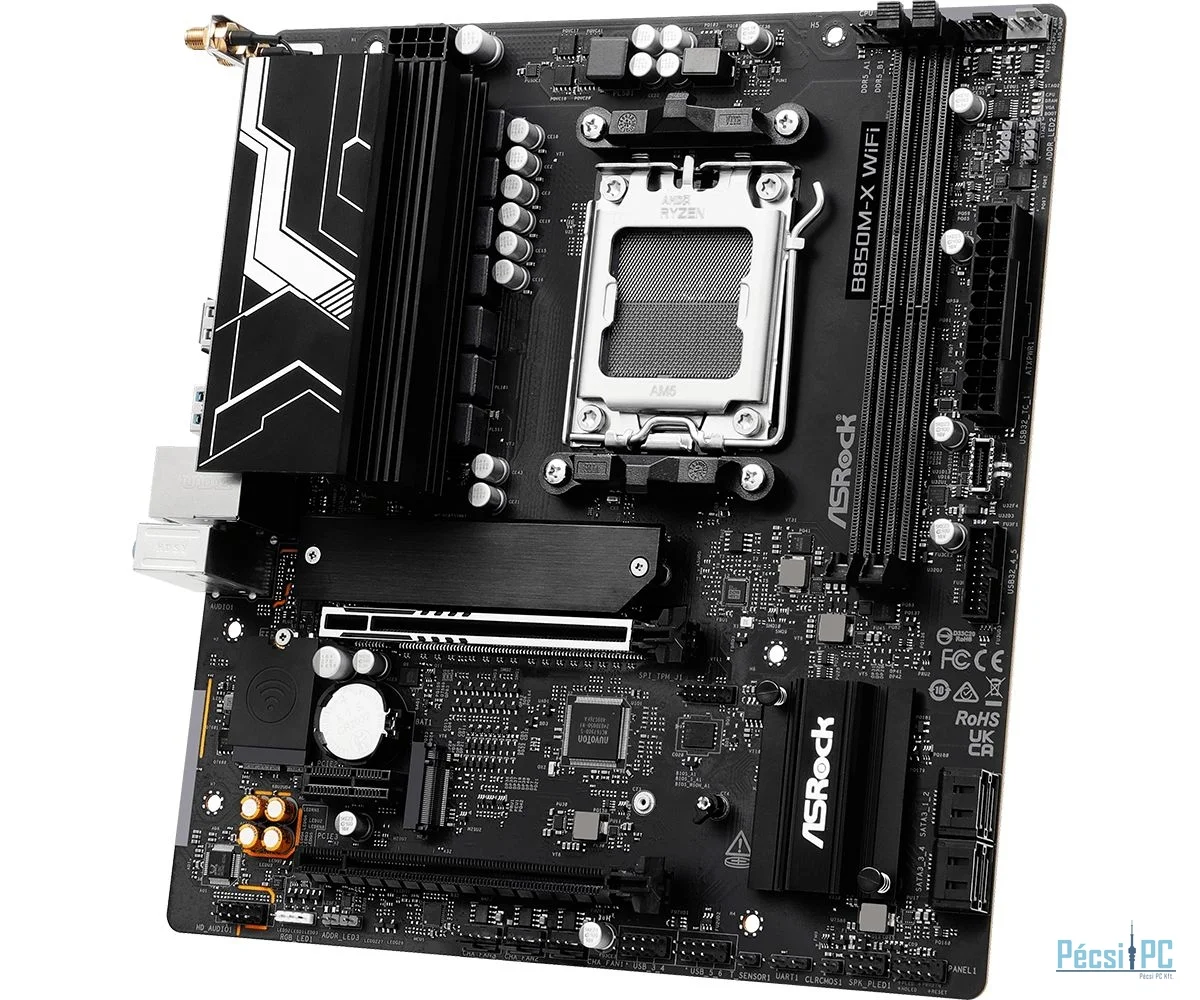 AM5, AMD B850, 2xDDR5, Max:5600MHz, Max:128GB, 2xPCIE16, 1xPCIE1, 4xSATA3, RAID, 2xUSB, 3xUSB3.2, 1xUSB3.2C, HDMI, DisplayPort, 7.1, 2.5Gb/s LAN, WiFi, Bluetooth, 1xHyper M.2, 1xBlazing M.2, Micro-ATX