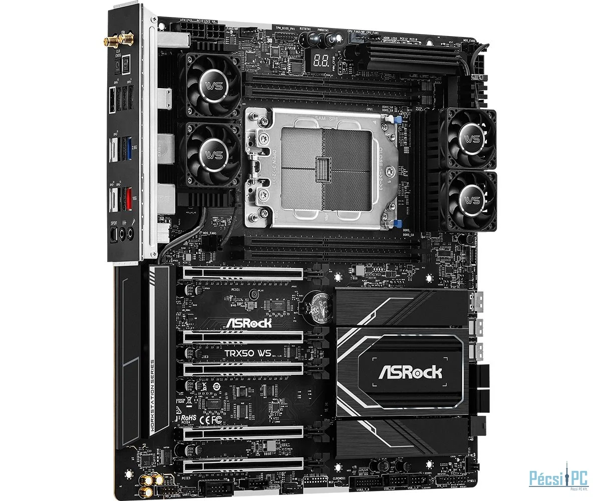 TR5, AMD TRX50, 4xDDR5, Max:7600MHz, Max:1024GB, 5xPCIE16, 4xSATA3, 6xUSB3.2, 2xUSB3.2C, 7.1, SPDIF optikai kimenet, 10Gb/s LAN, 2.5Gb/s LAN, WiFi, Bluetooth, 1xHyper M.2, 1xBlazing M.2, E-ATX