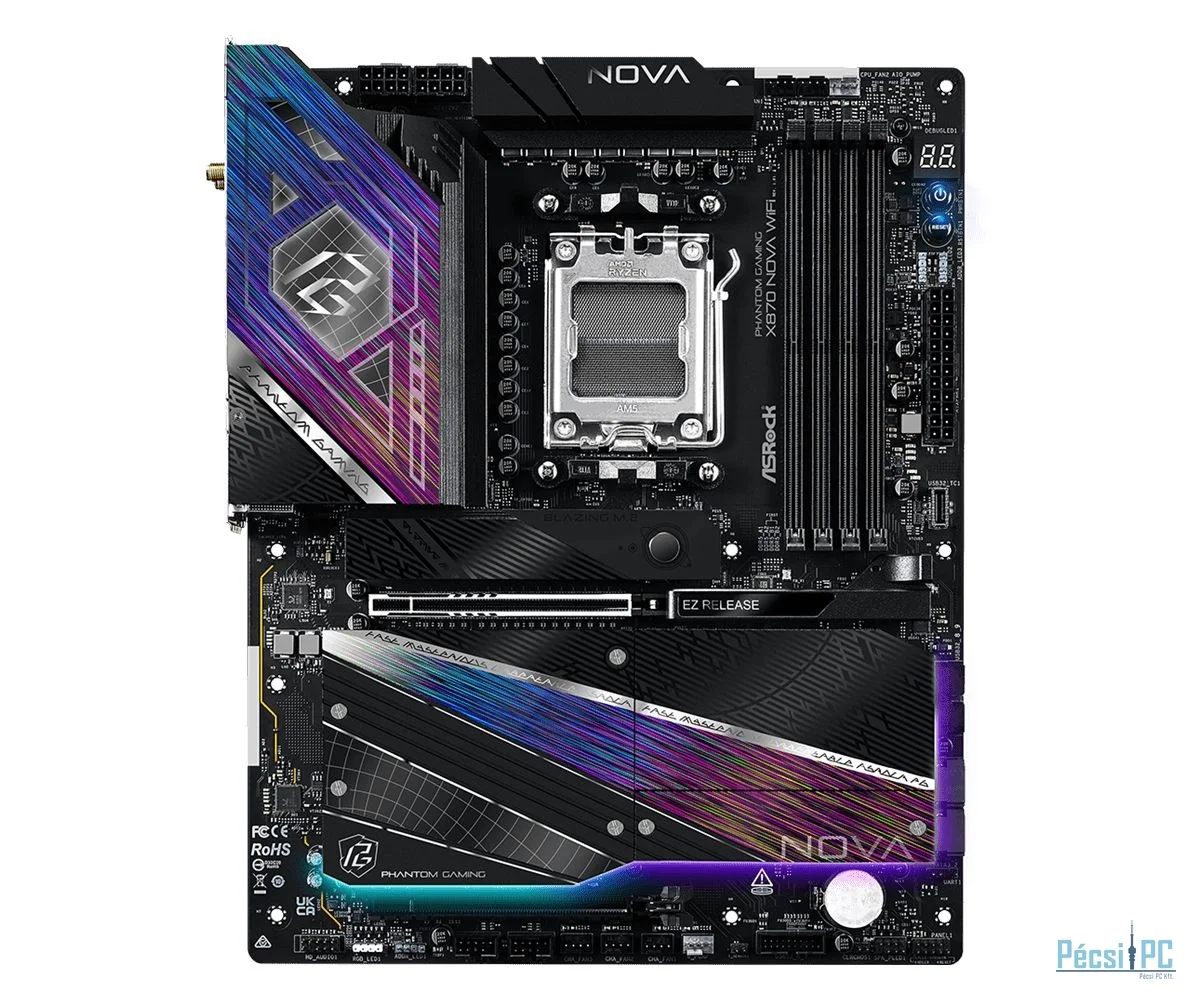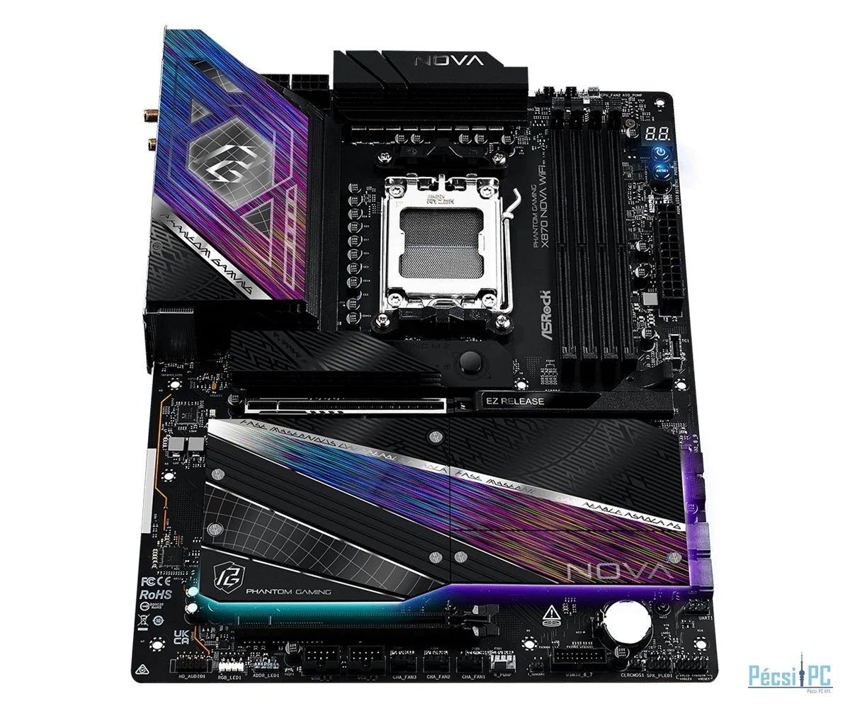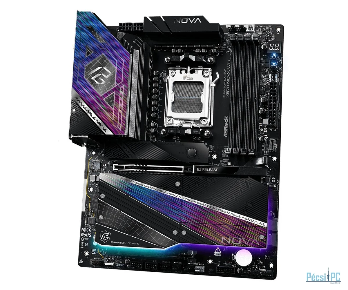 AM5, AMD X870, 4xDDR5, Max:5600MHz, Max:256GB, 1xPCIE16, 2xSATA3, RAID, 4xUSB, 5xUSB3.2, 2xUSB4.0C, HDMI, 7.1, SPDIF optikai kimenet, 5Gb/s LAN, WiFi, Bluetooth, 1xM.2, 2xHyper M.2, 2xBlazing M.2, ATX, RGB, Gamer