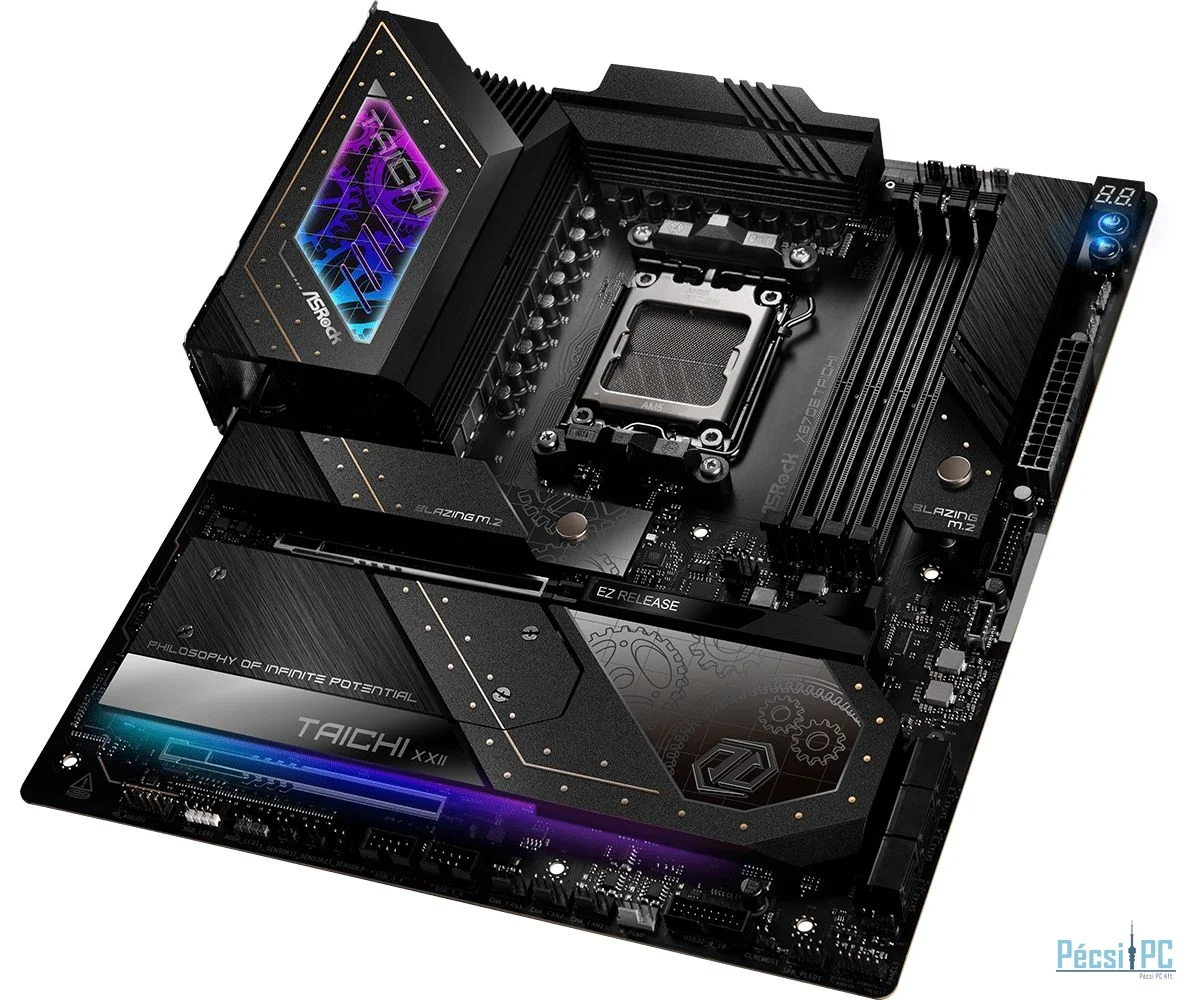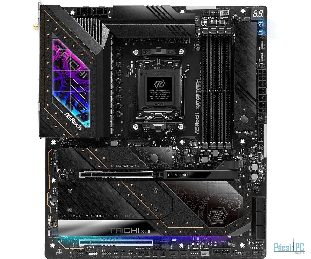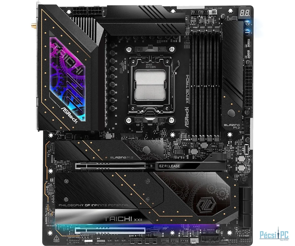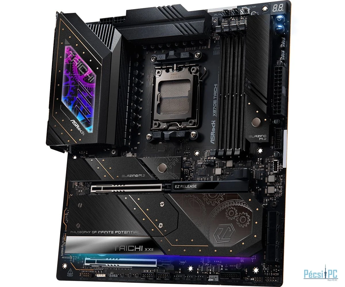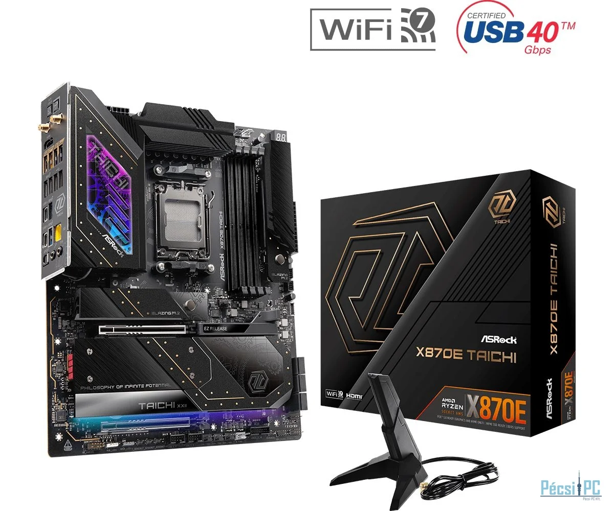AM5, AMD X870E, 4xDDR5, Max:5600MHz, Max:192GB, 2xPCIE16, 6xSATA3, RAID, 2xUSB, 8xUSB3.2, 2xUSB4.0C, HDMI, 5.1, SPDIF optikai kimenet, 5Gb/s LAN, WiFi, Bluetooth, 3xHyper M.2, 1xBlazing M.2, E-ATX, RGB, Gamer