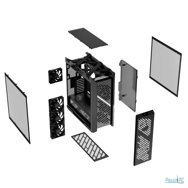 E-ATX, Black, 2x3,5", 4x2,5", 4xUSB3.2, 2xUSB Type-C, Audio, Táp nélkül, 591x565x250mm, Ventilátor:4x14cm, Tempered glass window, Gamer