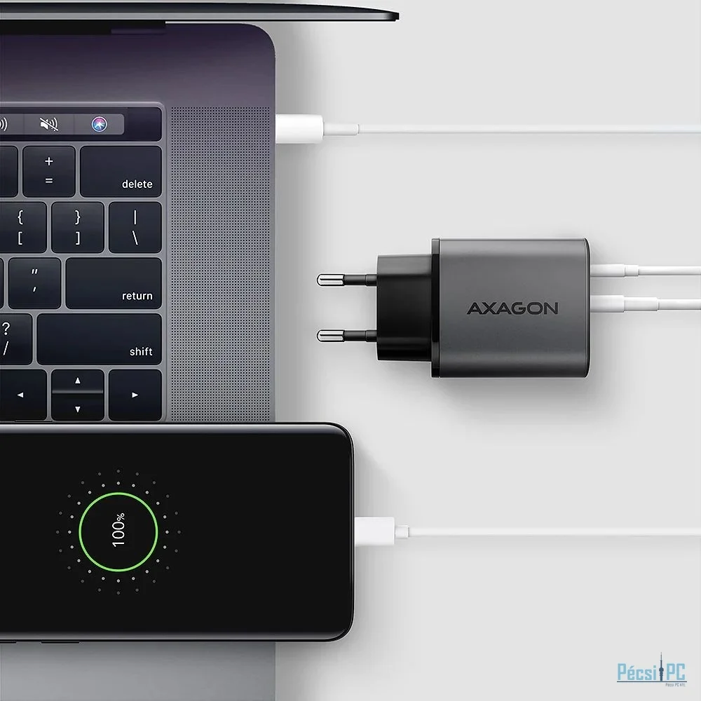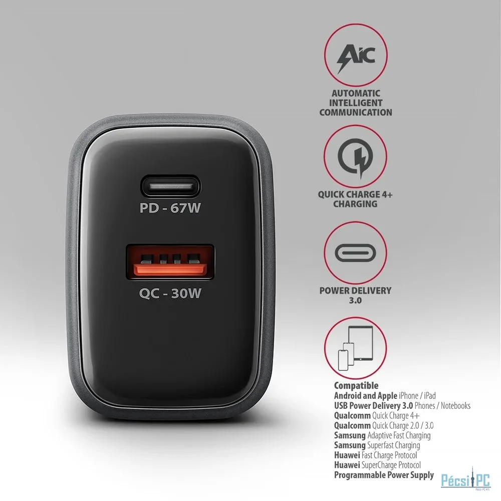 Az AXAGON ACU-PQ67D GaN utazási fali töltő lehetővé teszi akár két mobil eszköz egyidejű gyors töltését. A teljes 67 W kimeneti teljesítménynek köszönhetően a töltő a lehető legnagyobb sebességgel tudja tölteni a laptopokat, táblagépeket, telefonokat és egyéb mobil eszközöket. Az adapter nemcsak szabványos USB-A csatlakozóval, hanem fordítható USB-C csatlakozóval is rendelkezik. A tiszta LCD kijelzőn látható az aktuális töltési teljesítmény.
