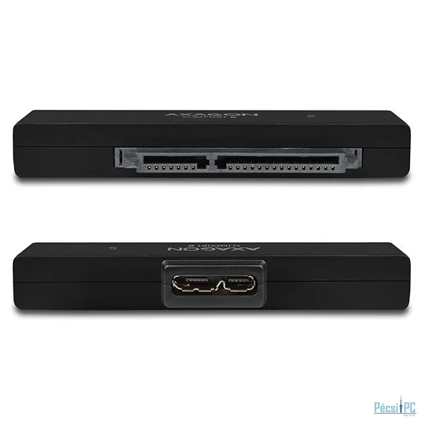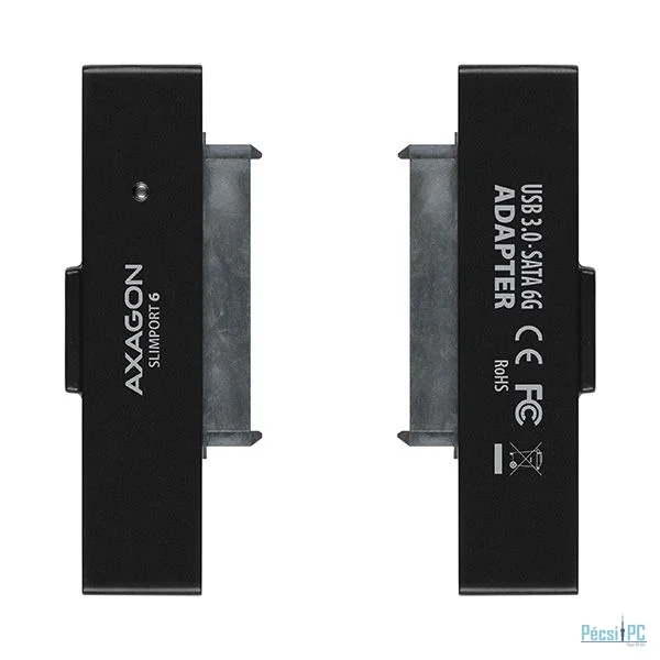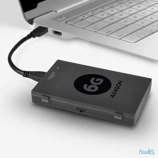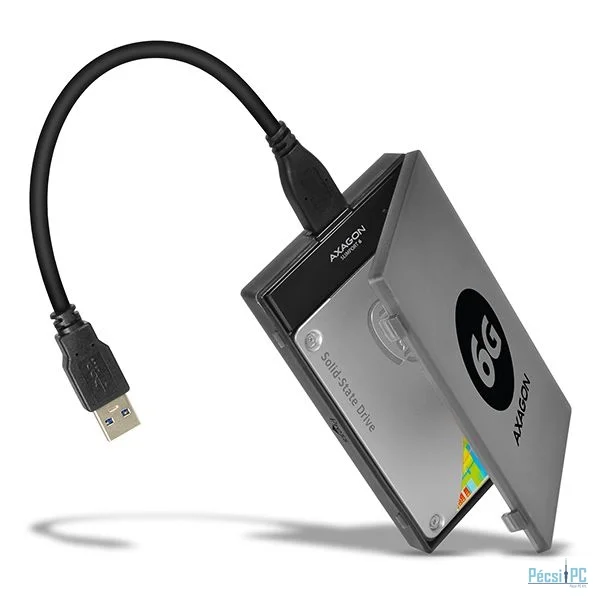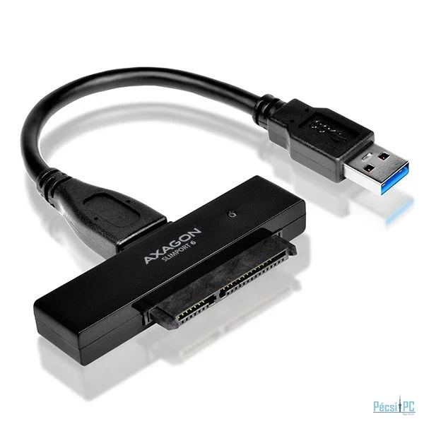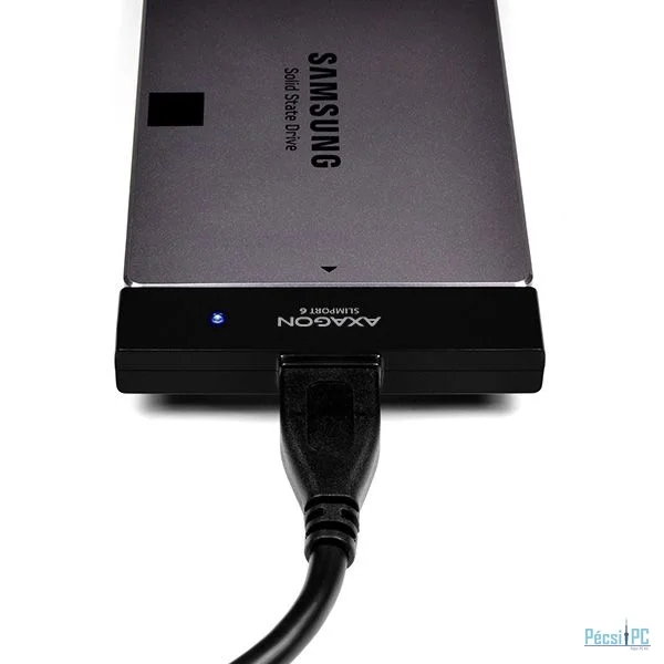 Egy kompakt AXAGON ADSA-1S6 SLIMport6 nagysebességű adapter USB 3.0 és SATA 6G interfésszel egy SSD vagy 2.5" SATA merevlemez könnyű csatlakoztatásához.