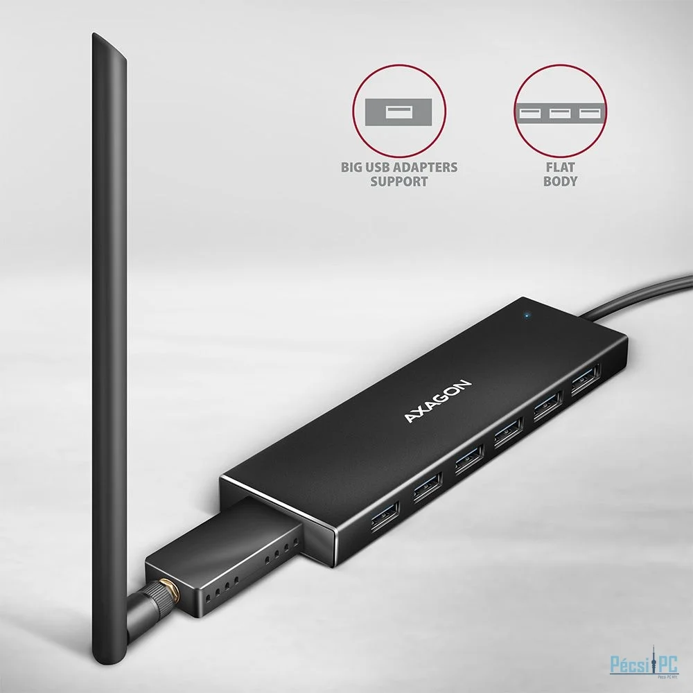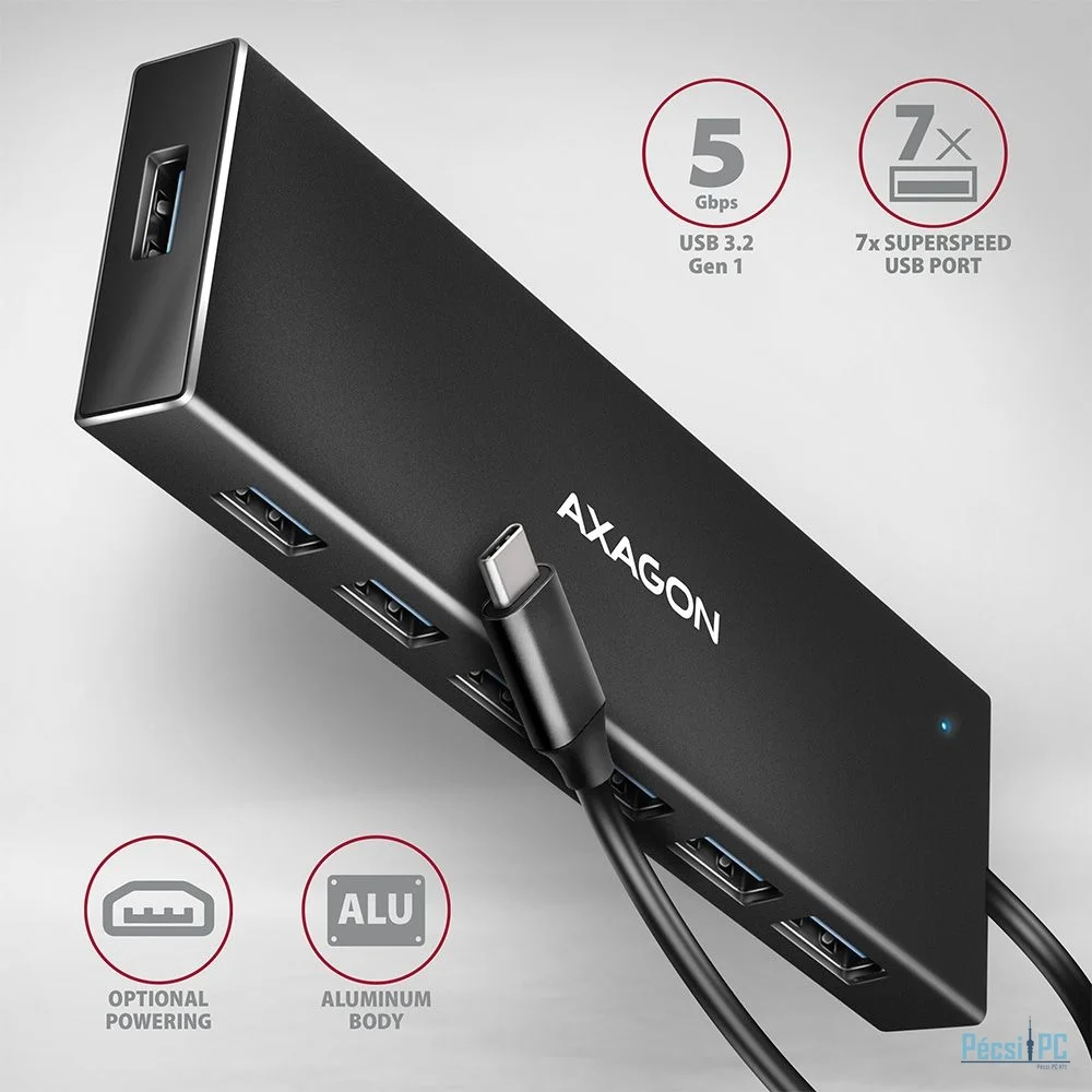 A vékony USB-C 3.2 Gen 1 (USB 3.0) hub AXAGON HUE-F7C 30 cm hosszú USB-kábellel könnyen és gyorsan csatlakoztat egyszerre akár hét USB-eszközt a számítógéphez. Az USB 3.2 Gen 1 szabvány lehetővé teszi az 5Gb/ssebességű átviteli sebességet.