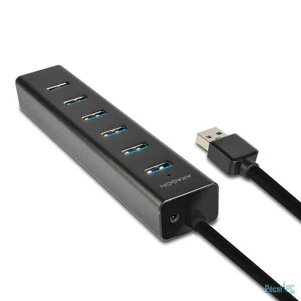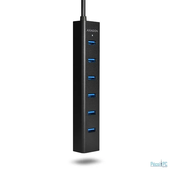 A hét portos AXAGON HUE-SA7BP ALU CHARGING USB 3.0 hub saját áramellátással és gyors töltési támogatással az összes USB portján.