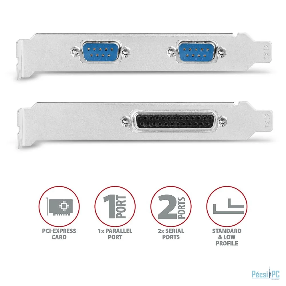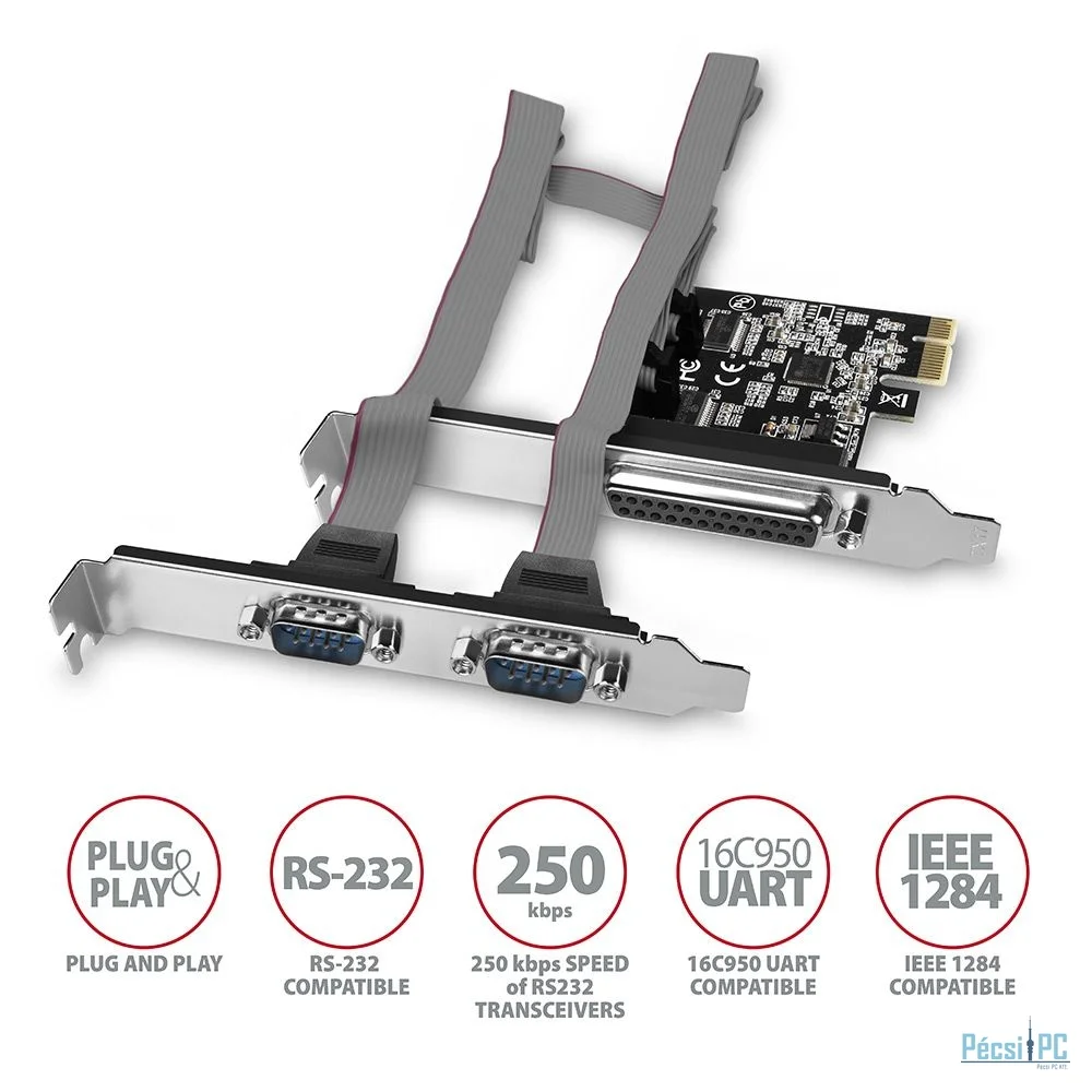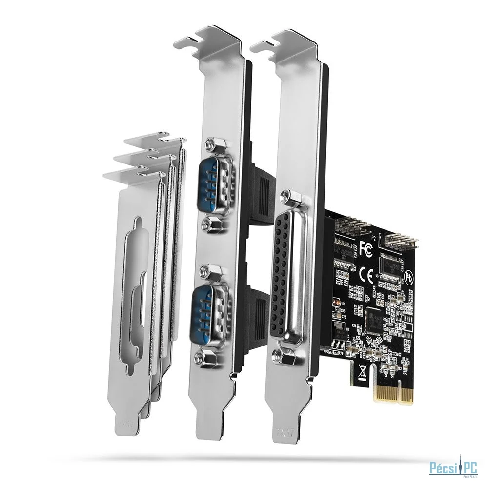 Az AXAGON PCEA-PSN PCI-Express kártya felruházza az asztali számítógépet egy, DB25-ös csatlakozóval ellátott párhuzamos, és két, DB-9 csatlakozós, RS-232 szabványos soros porttal.