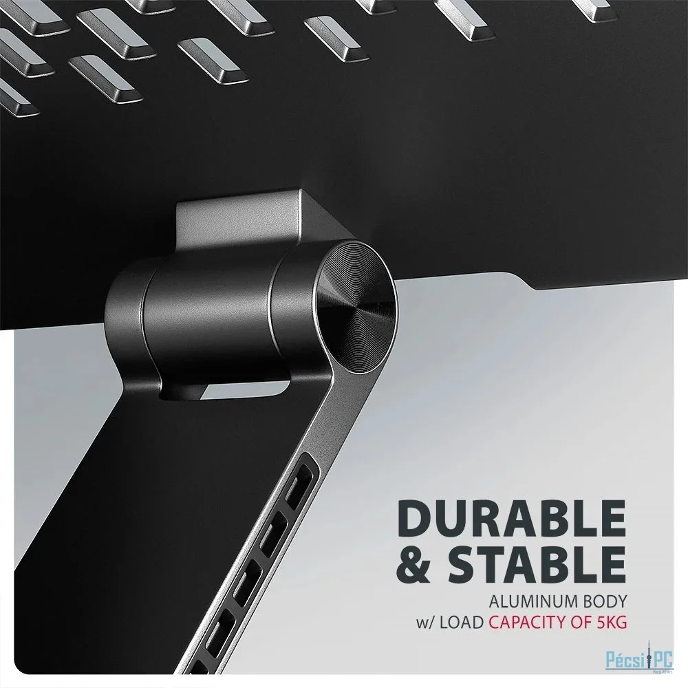 A laptop állvány robusztus alumíniumöntvényből készült, ami hosszú élettartamot és megbízhatóságot garantál. A csúszásmentes kezelésnek köszönhetően készüléke biztonságosan a helyén marad a nem kívánt mozgások kockázata nélkül, anélkül, hogy kárt okozna a laptop vagy a pad felületében. Ezek a gondosan megtervezett funkciók tökéletes stabilitást biztosítanak laptopja, táblagépe vagy kedvenc könyve számára, így nyugalmat és kényelmet biztosít a mindennapi használat során.
