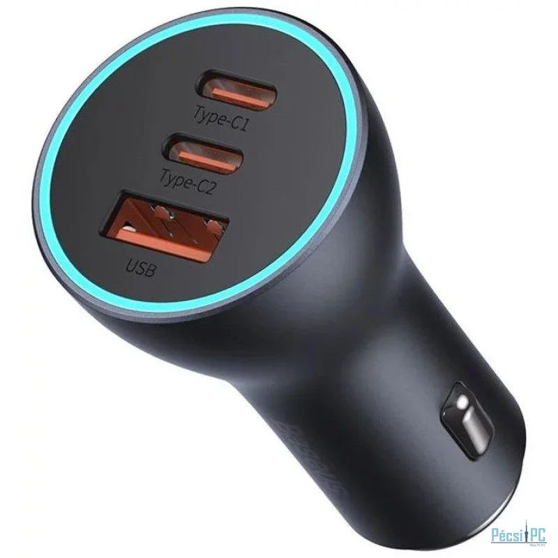Autós töltő, 1xUSB-A, 2xUSB-C, 5V/9V/10V/12V/15V/20V, 3,25A, 65W, QC, PD, Grey