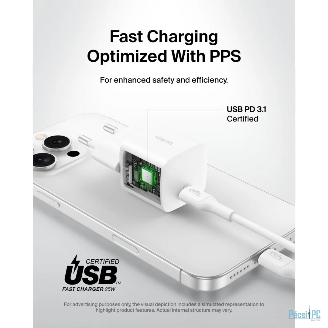 Hálózati töltő, 1xUSB-C, Kábel csatlakozó USB-C , 3V/5V/9VV, 2,77A, 25W, PD, White