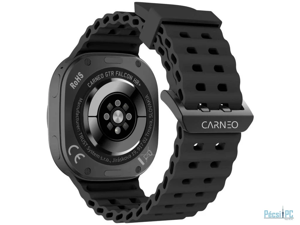Fedezze fel a CARNEO GTR Falcon HR+ okosórát, amely a csúcsteljesítményt a luxuskivitelű dizájnnal ötvözi. Az elegáns, fémesen fekete, titánszínű rozettával ellátott házat egy kerek SUPER AMOLED kijelző egészíti ki, amelyet tartós Gorilla Glass üveg véd, így órája mindig úgy fog kinézni, mint újkorában. Velük kézben tarthatja egészségét – mérik a pulzust, a vér oxigénszintjét, a vérnyomást, a stresszt, a BMI-t, az elégetett kalóriákat, a megtett távolságot és az alvás minőségét. Az erős 400 mAh akkumulátor akár 7 napig is bírja, az IP67 tanúsítvány pedig biztosítja a víz- és porállóságot. A cserélhető szilikon szíj könnyen az aktuális öltözékéhez igazítható. Válasszon olyan stílust, amely illik az öltönyhöz és a szabadidős ruhához is. Az iOS-szel és az Androiddal való kompatibilitás, valamint a teljesen szlovák alkalmazás garantálja, hogy az első érintéstől kezdve megérti az órát.